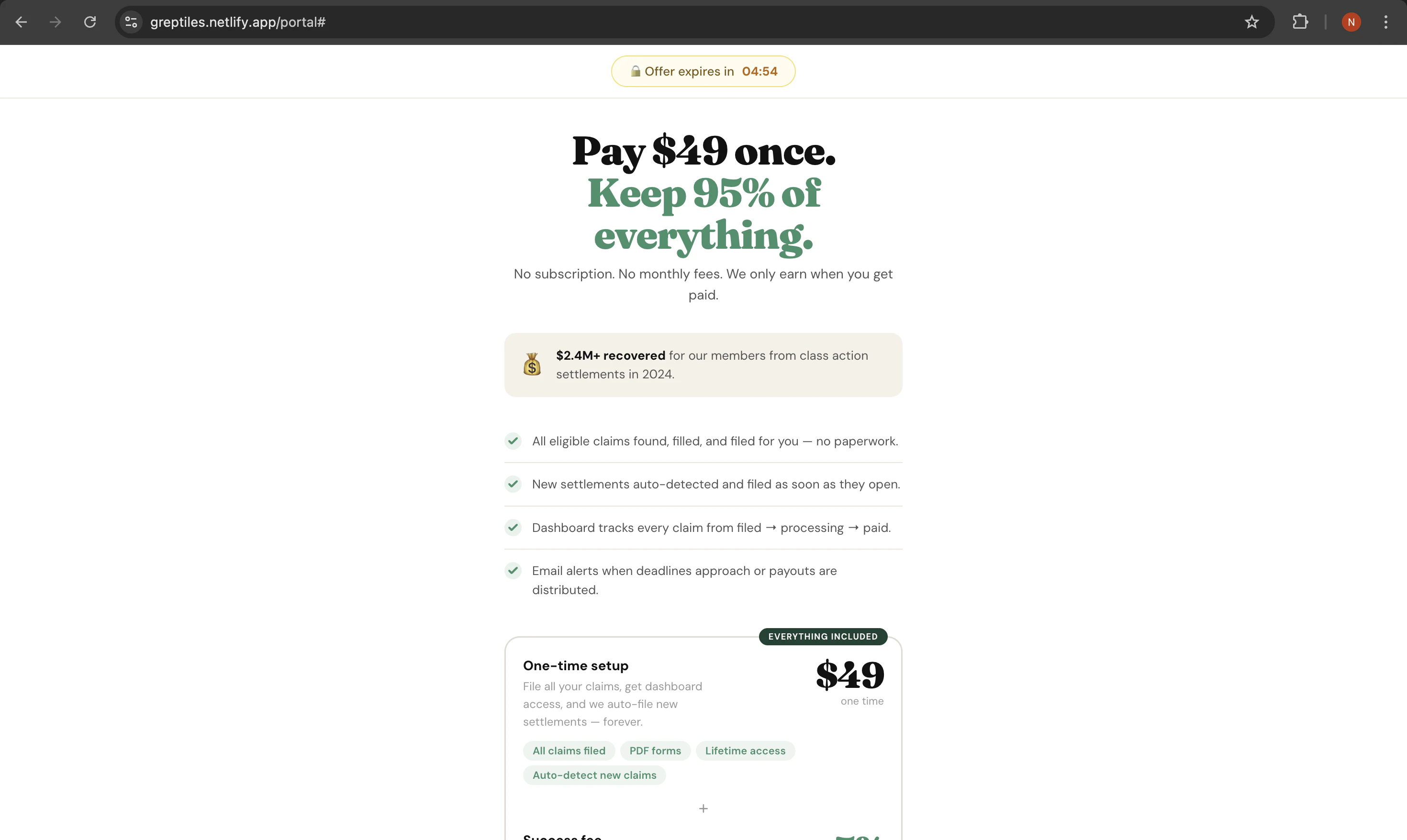 ## 概要 Greptilesは、あなたに代わって集団訴訟の和解申請を発見・提出するAIエージェントです。ウェブ上で有効な和解情報を継続的に検索し、資格の可能性がある案件を絞り込み、申請を自動で...