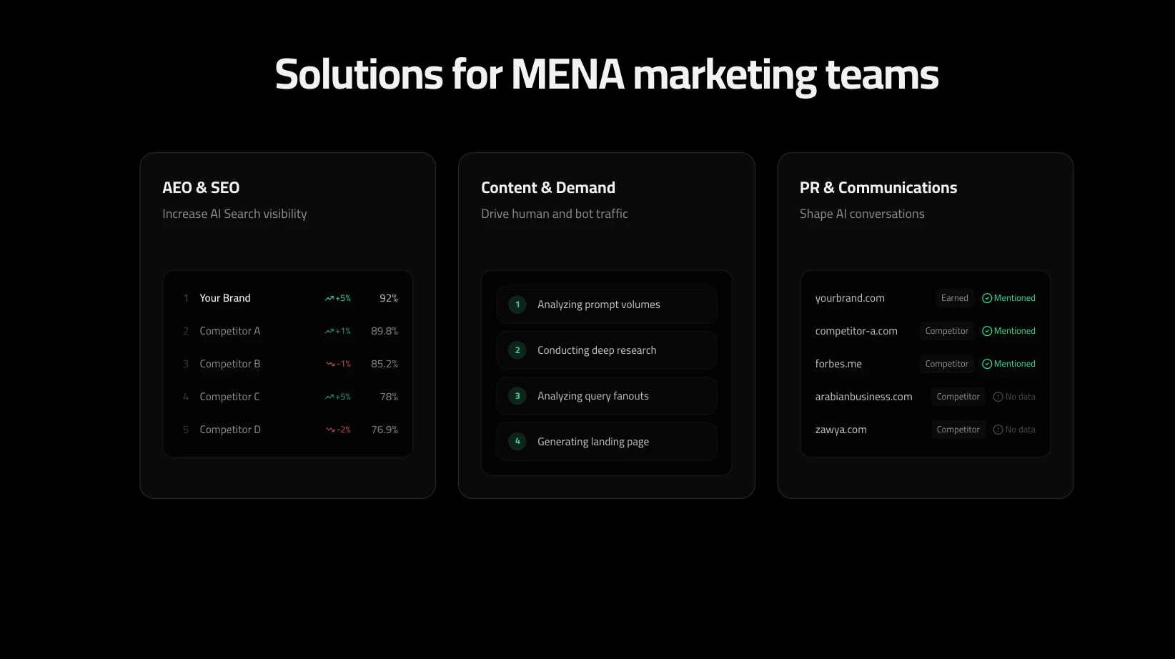 ## 概要 - 中東向けの初のAI可視性プラットフォーム GEOPLEX。ChatGPT、Perplexity、Gemini ほかのAIエンジンを横断してブランドの言及を追跡・可視化します。 -...