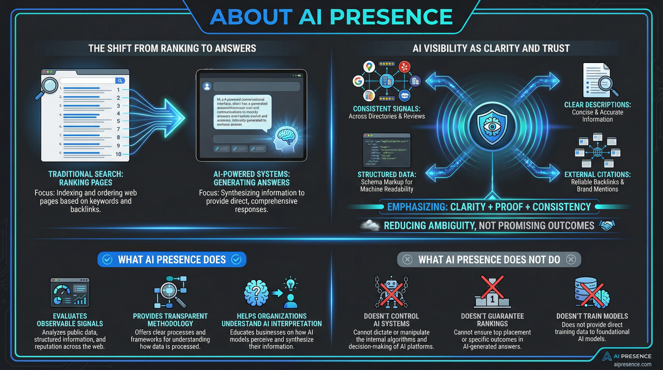 ## 製品概要 AI Presence は、ブランドがAI回答エンジンでどう説明されるかを監査し、競合と比較します。鍵・設定は不要。ウェブサイトを入力すると、回答エンジンごとに標準化されたチェッ...