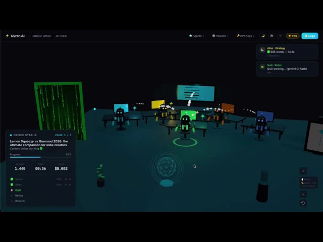 ## 概要 - Uvron AI は20種類以上の専門エージェントを連携させ、ローカルで動く自動化パイプラインを作ります。 - 各ミッションパックは3–5名の専門エージェントが順番に作業を引き継...