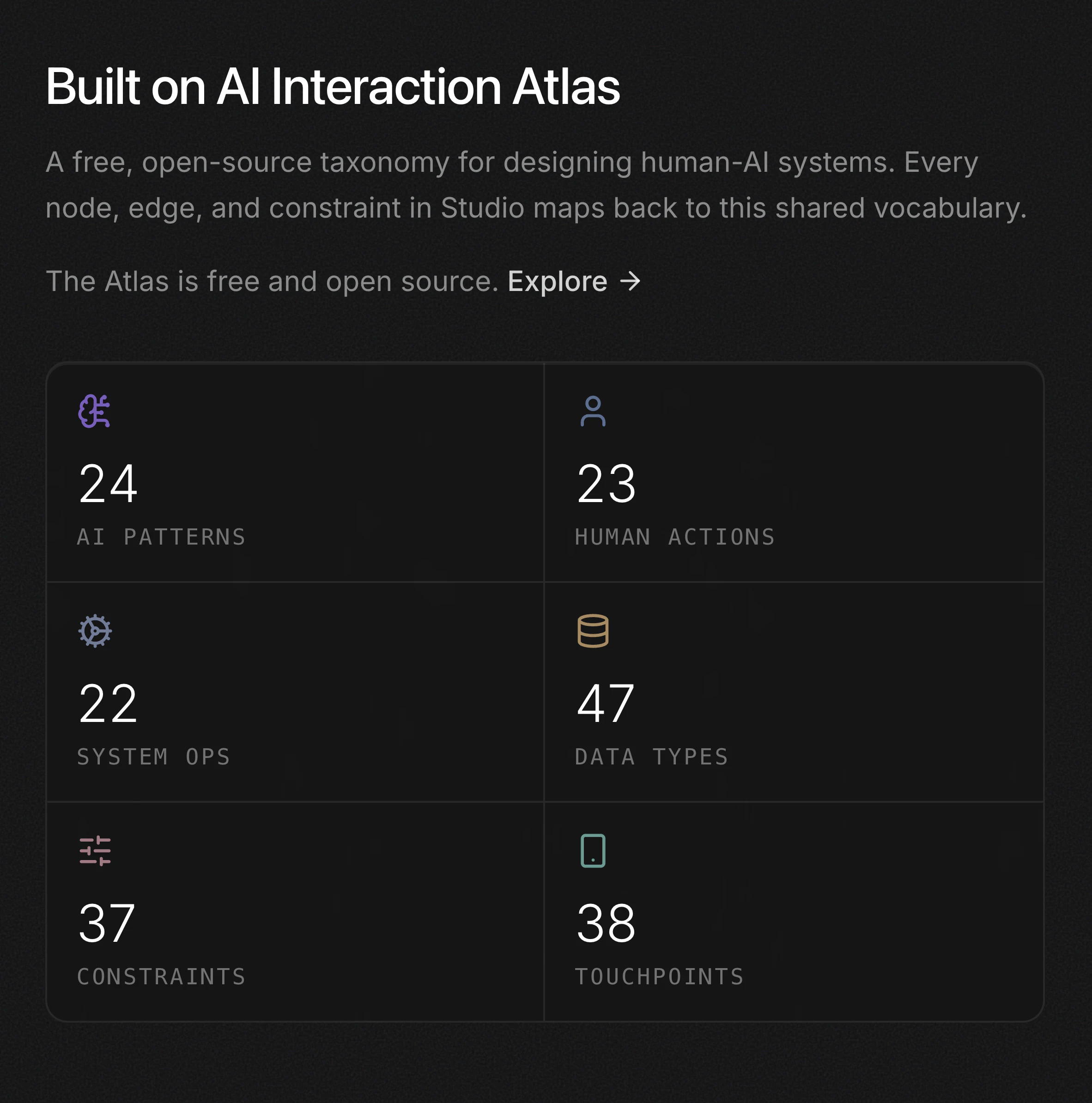 ## 概要 - AIワークフローの可視化・設計を支えるビジュアルツール。50以上の人間-AIインタラクションパターン分類を基盤に、ノードをタスク・データ・制約・アクター・タッチポイントなど意味付...