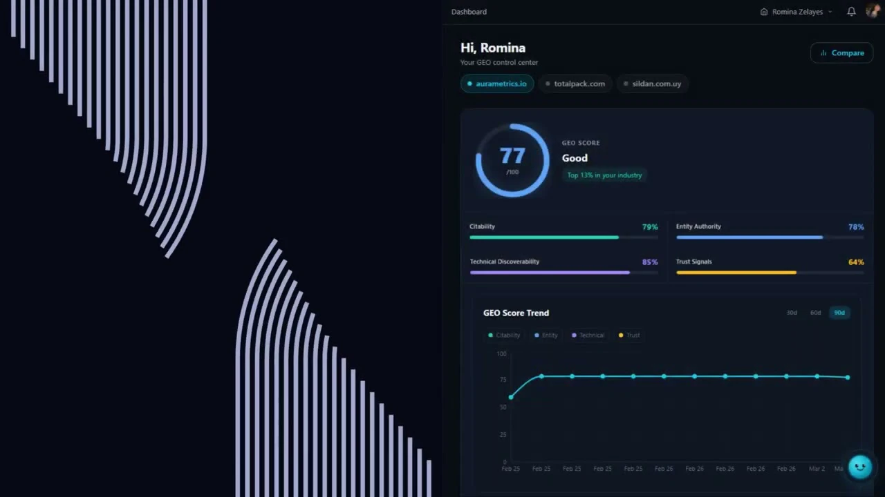 AuraMetricsはAI検索におけるブランド露出を測定するツールです。ChatGPT、Gemini、Claude、Perplexity などの回答に自社ブランドが現れるかを分析し、競合との比...