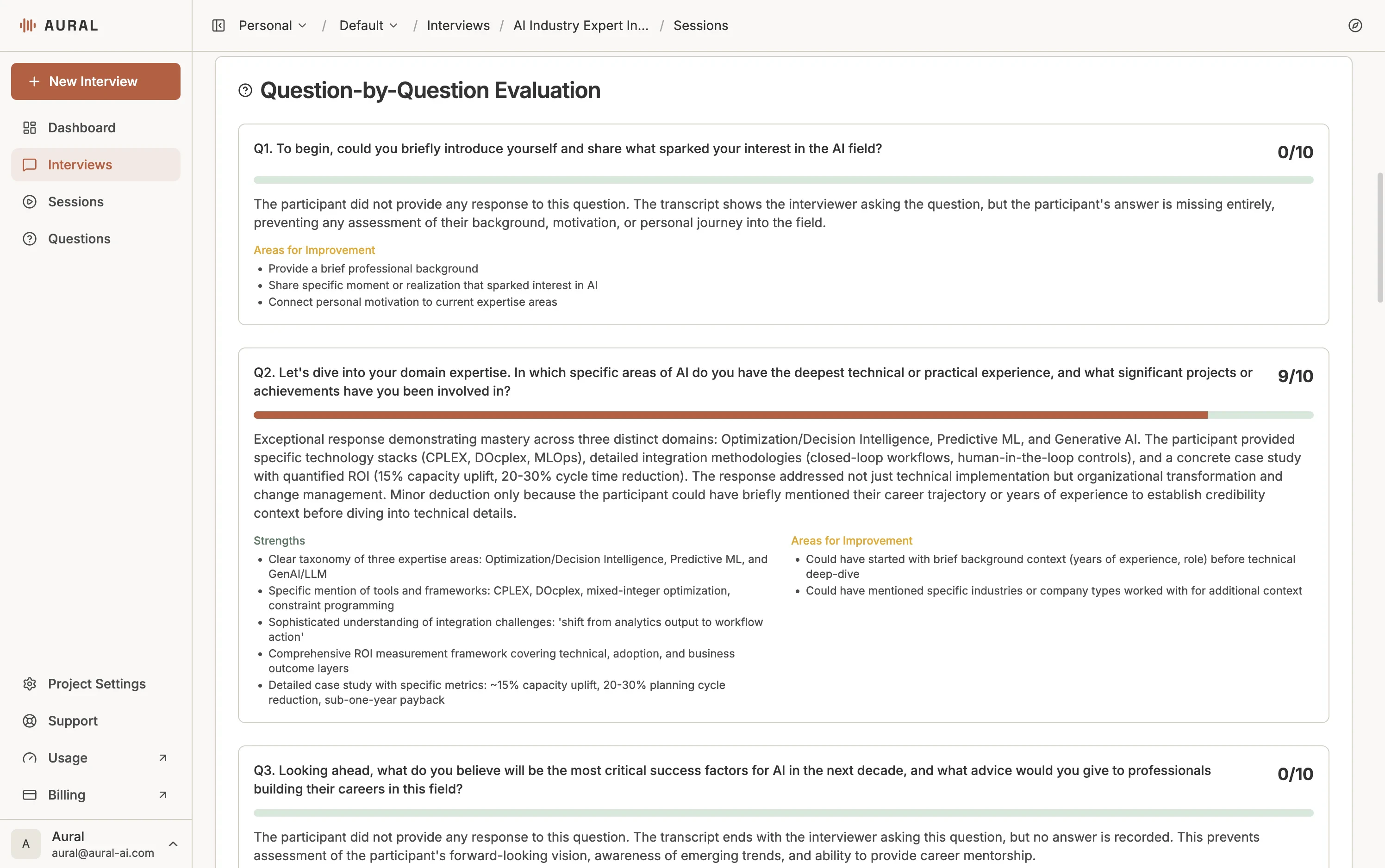 ##概要 Auralはチャット・音声・ビデオの3モードに対応するAI面接プラットフォーム。学習したい内容を指示するとAIが面接構造を作成、リンク経由で参加者が参加。リアルタイムで深さとトーンを調...