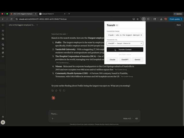 ## 概要 Transfr AI は Claude、ChatGPT、Gemini の間で会話の文脈を数秒で転送する拡張機能です。拡張をクリックして出発元と宛先を選ぶと、文脈を圧縮して自動挿入・自...