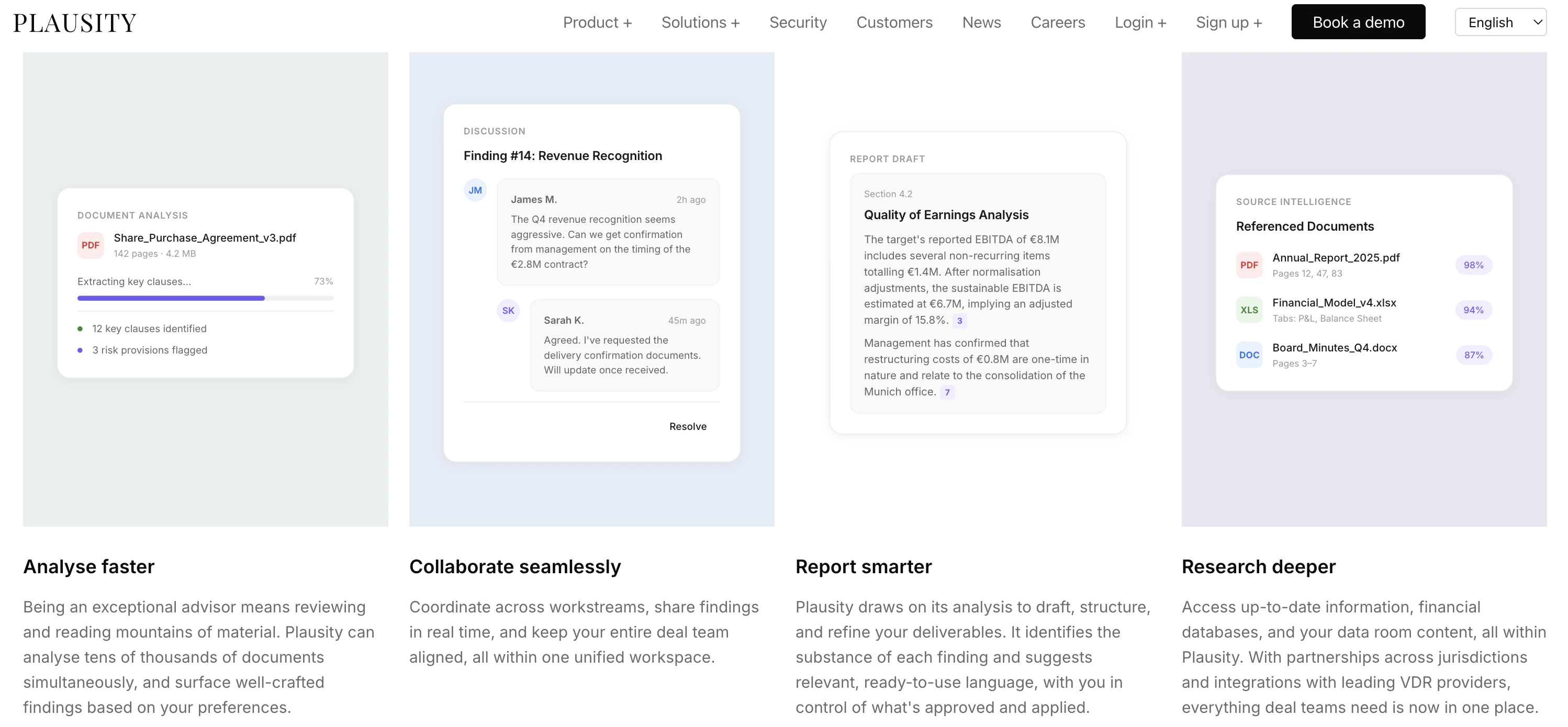 Plausity automates the full due diligence workflow for PE, VC, M&A and advisory teams. 12 workstr...