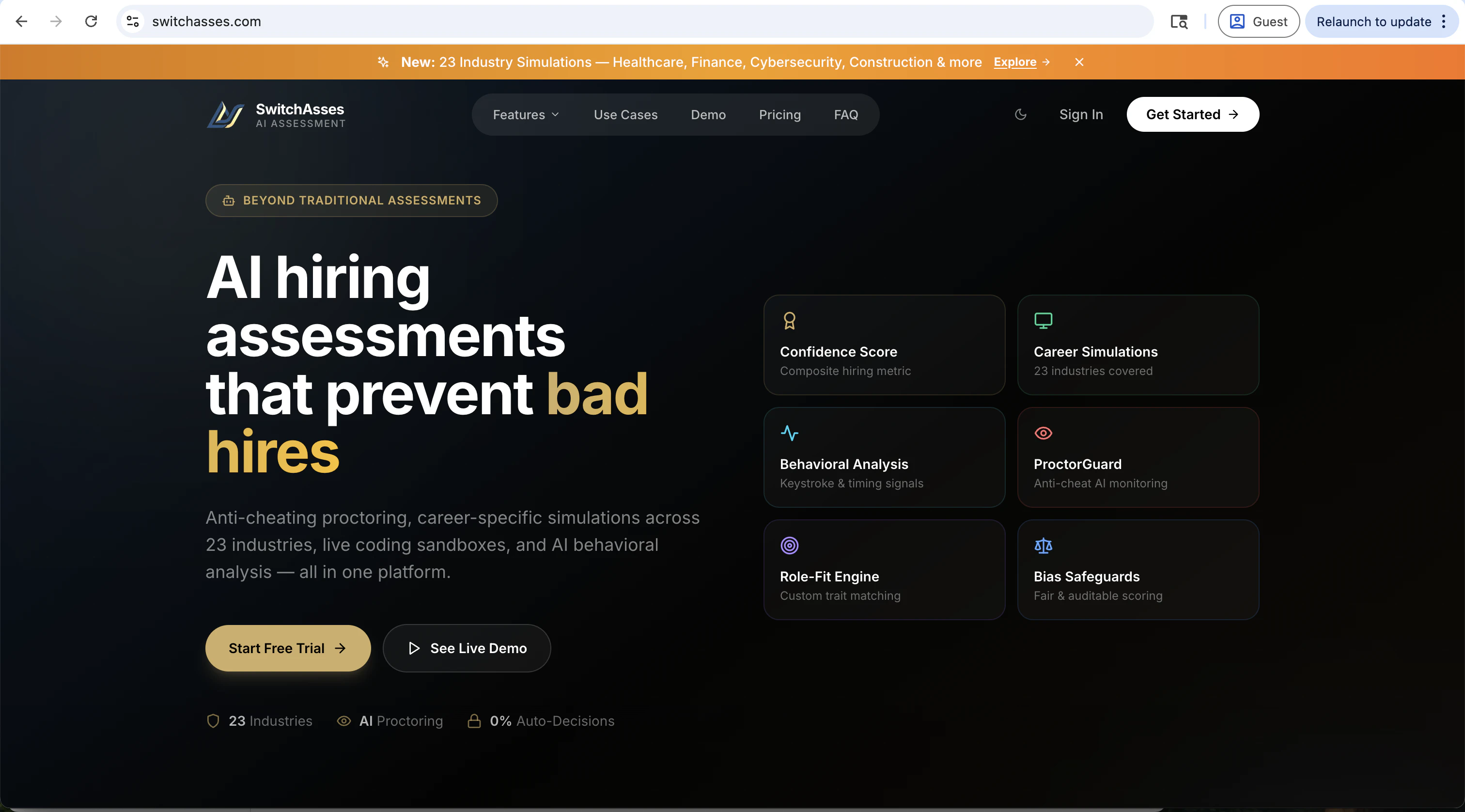 Anti-cheating proctoring, career-specific simulations across 23 industries, live coding sandboxes...