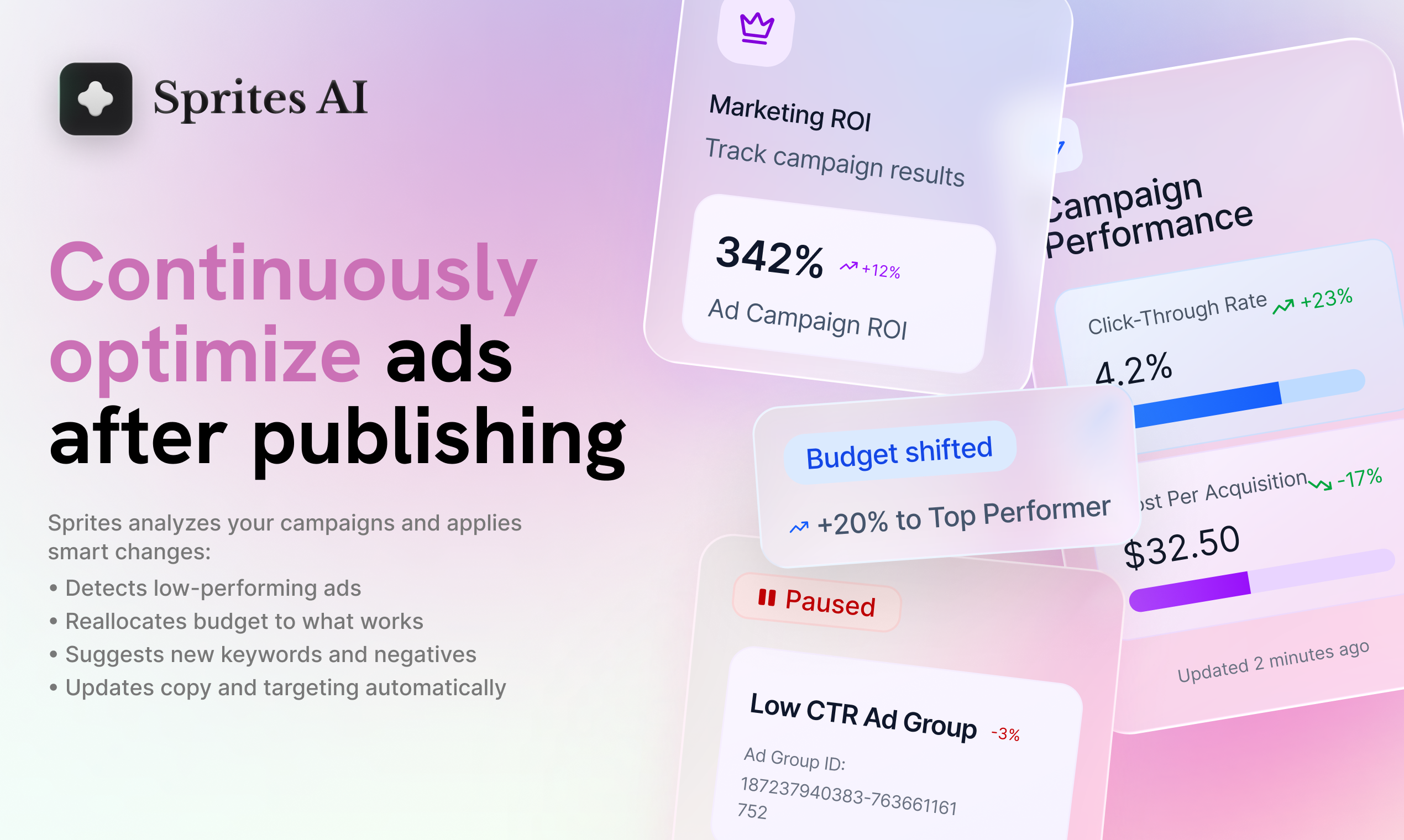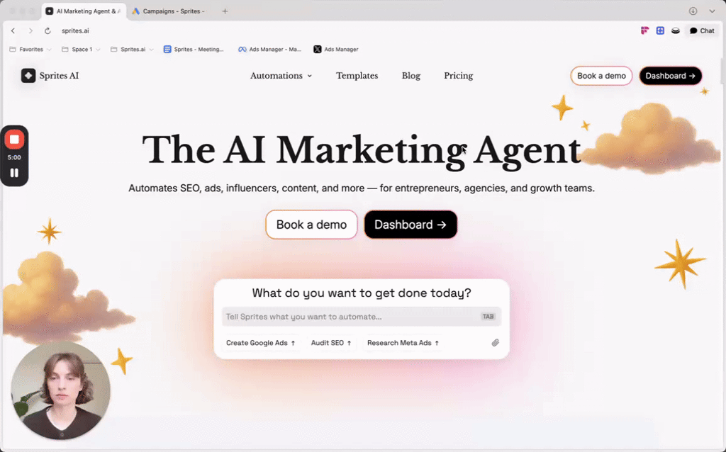 SpritesはGoogle広告をAIエージェントで自動化するプラットフォーム。目標を学習し、キャンペーンを実行・最適化して結果を継続的に改善します。リテイナーやレポートは不要で、広告運用を自動...