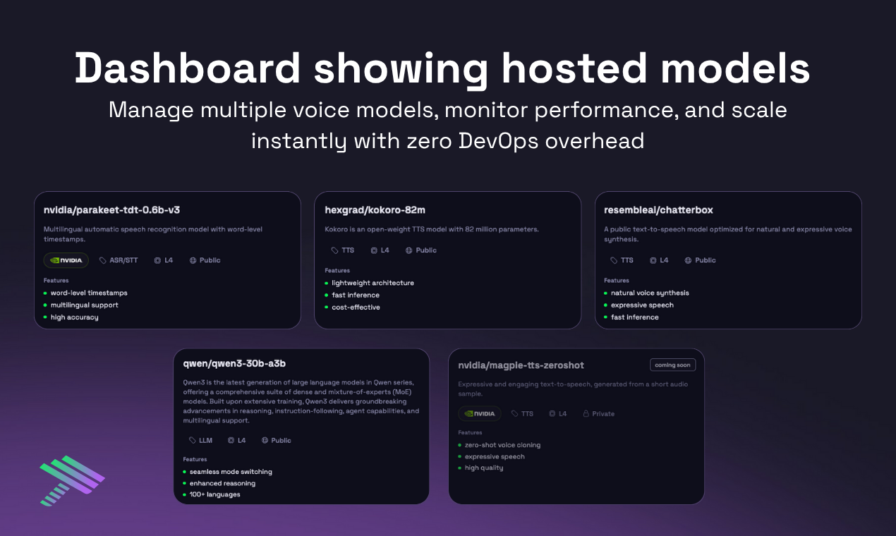 音声モデルのホスティングとファインチューニングを、インフラ管理の負担を軽減して提供。オープンソースモデルの自由度、世界各地のエッジ配信、低遅延、サーバーレスエンドポイント、ベータ版の初期ユーザー...