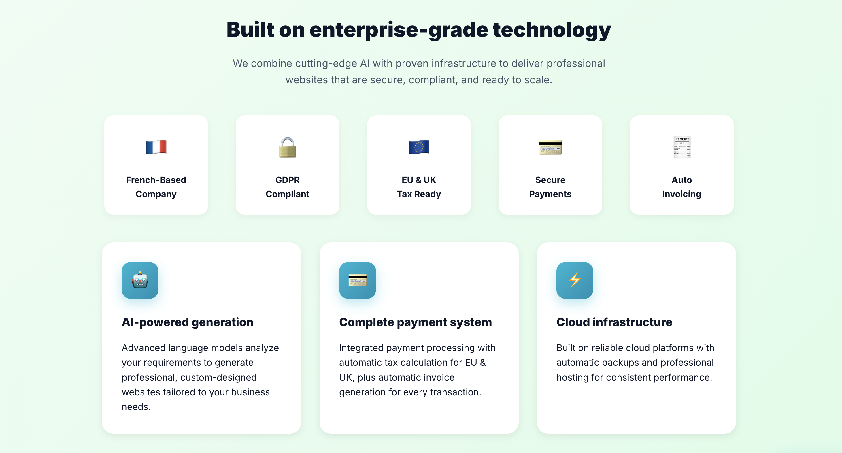 ## 概要 think2siteは、4つの質問に答えるだけで、デザイン、フロントエンド、バックエンド、ホスティング、決済、EU/UK税務対応を含む全機能を自動生成し、即時にデプロイ可能なプロ仕様...