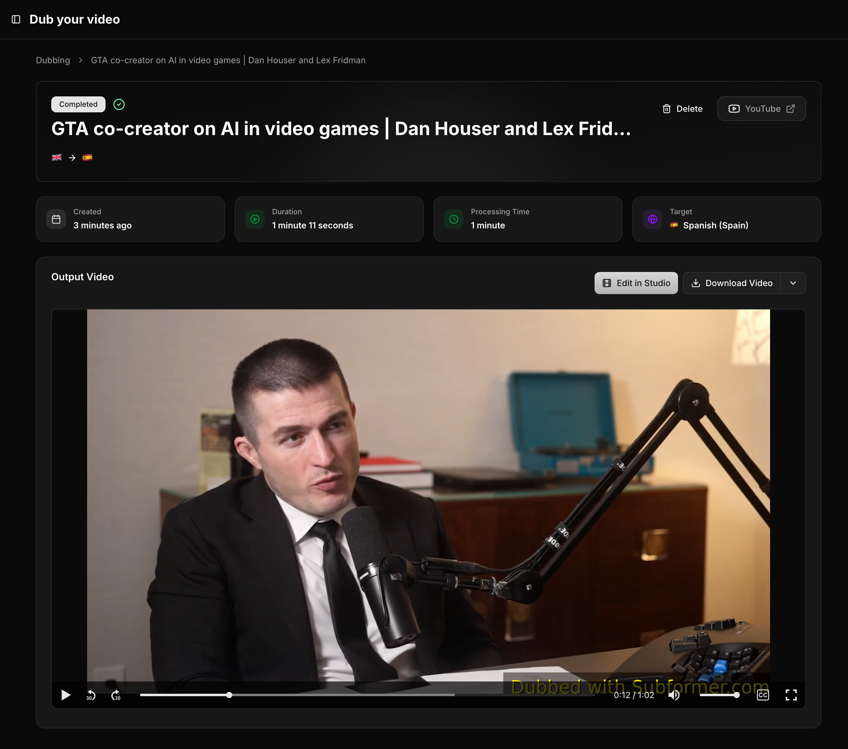 ## 概要 - SubformerはAI吹き替えプラットフォーム。119言語以上に即座に吹き替え、スタジオ機能でタイミング・翻訳を微調整し、数分でエクスポート。 ## 主な機能 - 119言語...