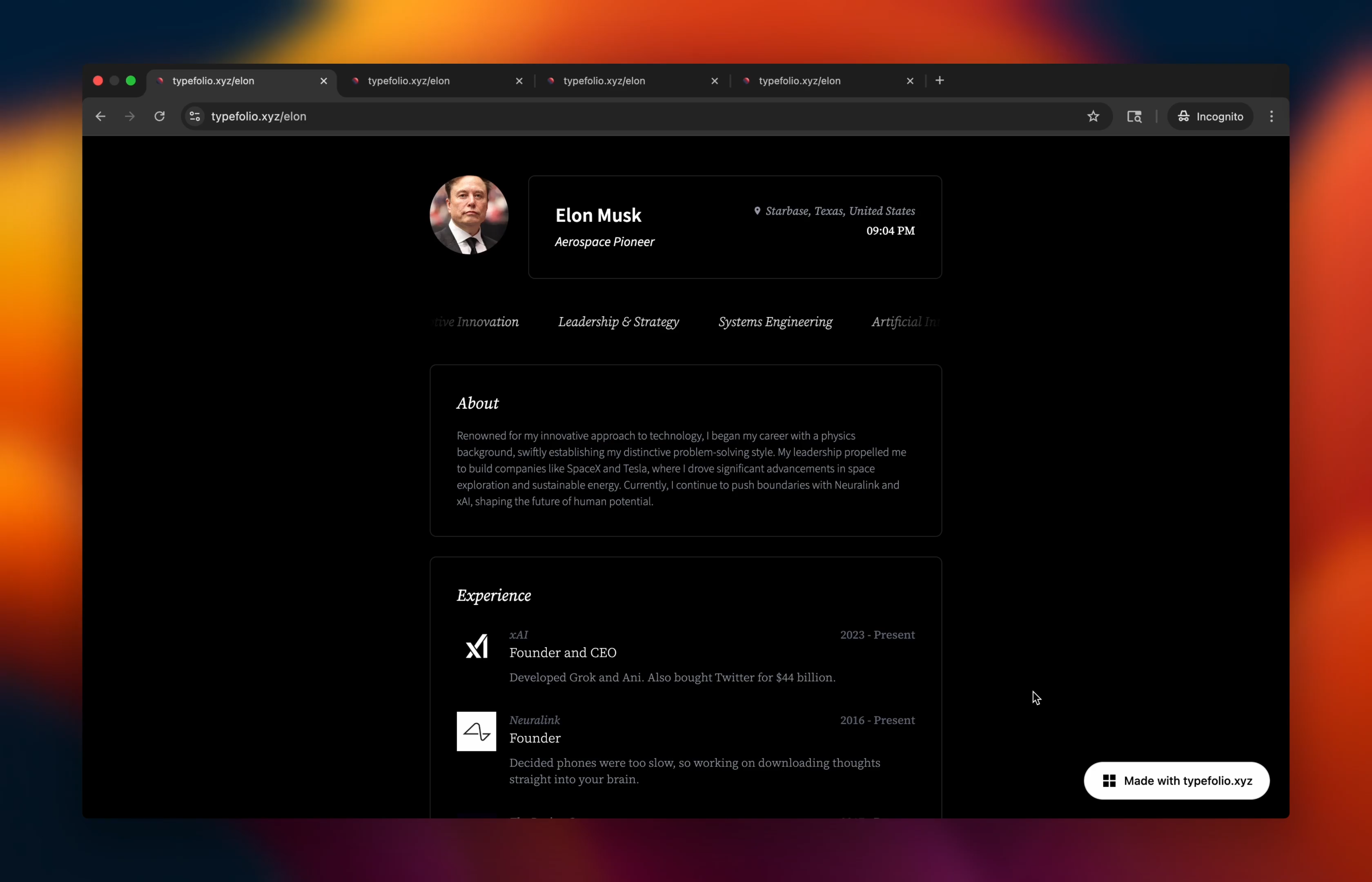 Typefolioは、履歴書やCVから直接美しく整った個人サイトを瞬時に作成するミニツールです。文書ベースの入力をもとに、デザイン知識がなくてもプロ仕様のポートフォリオへ自動変換します。従来のサ...