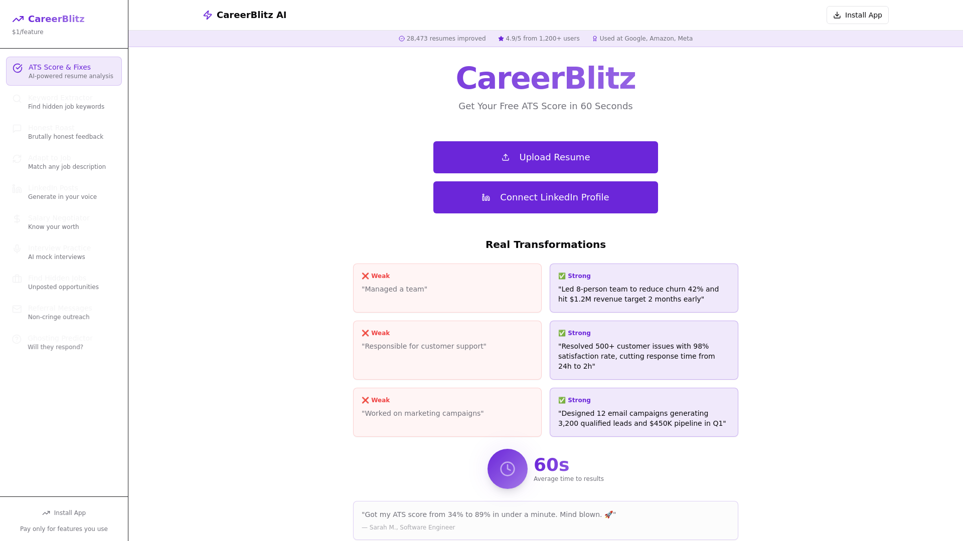 ## 概要 60秒で履歴書を修正できるオンラインツール。料金は2ドル。ATS最適化された改善、言い換え済みの箇条、Word/PDFのダウンロード版を提供。5,000名以上の専門家が利用しています...