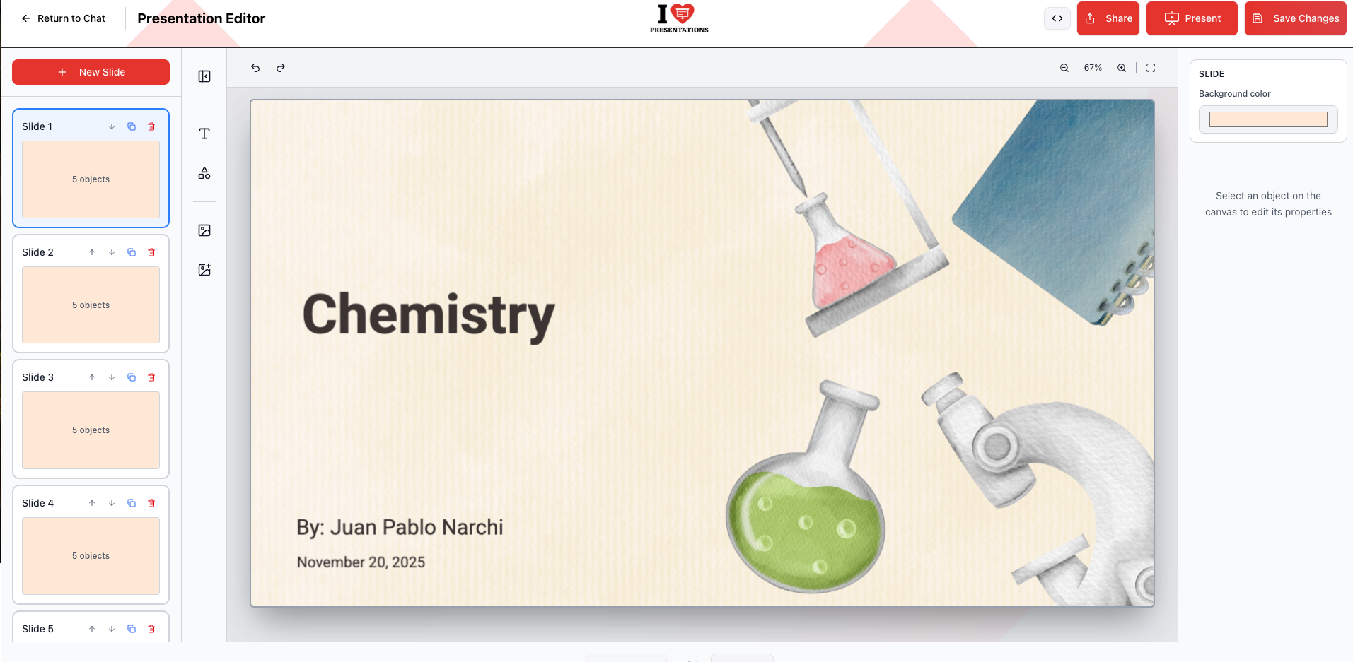 ## 概要 AIとチャットするだけでプレゼンを自動作成。迅速で、ビジネスやプロジェクト向けに最適化。学生が作ったツールで、学生・クリエイター・創業者・アイデアを形にしたい人を主な対象とします。使...