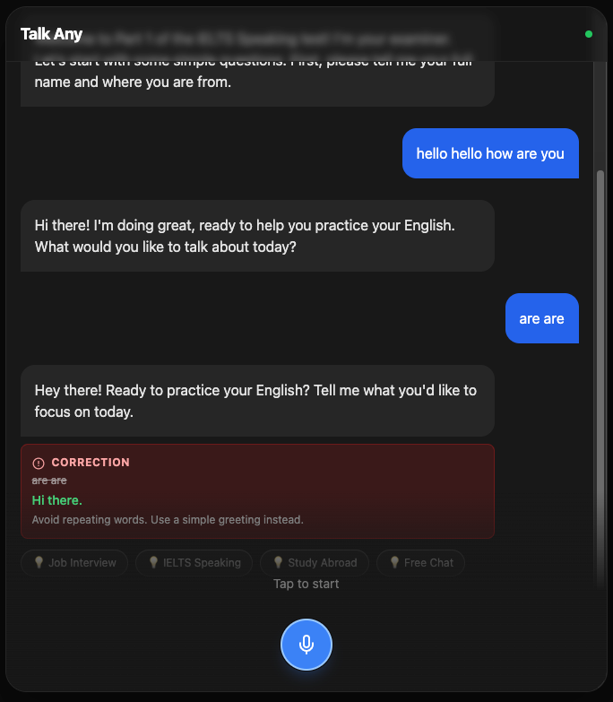##概要 TalkAnyは完全無料のAI音声チャットで英語を練習できるWebサービス。パートナー不要でブラウザを開くだけですぐ会話開始。無制限の対話時間、各文のリアルタイム文法訂正と最適化提案、...