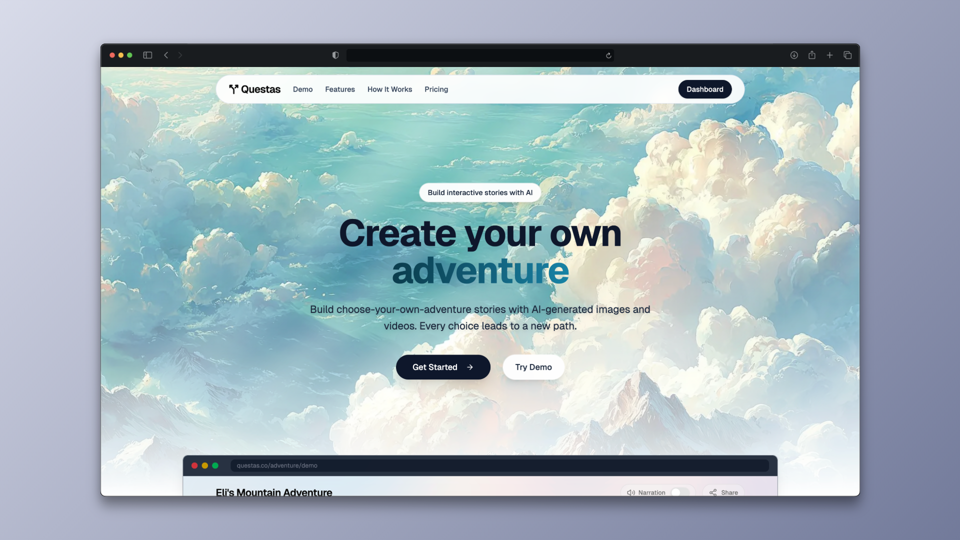 Questas は AI 生成の画像と動画を組み合わせて、分岐する選択型ストーリーを作成・編集・共有できるツールです。キャラクターと概念、ビジュアルスタイルを指定するだけで、 AI アートと連携...