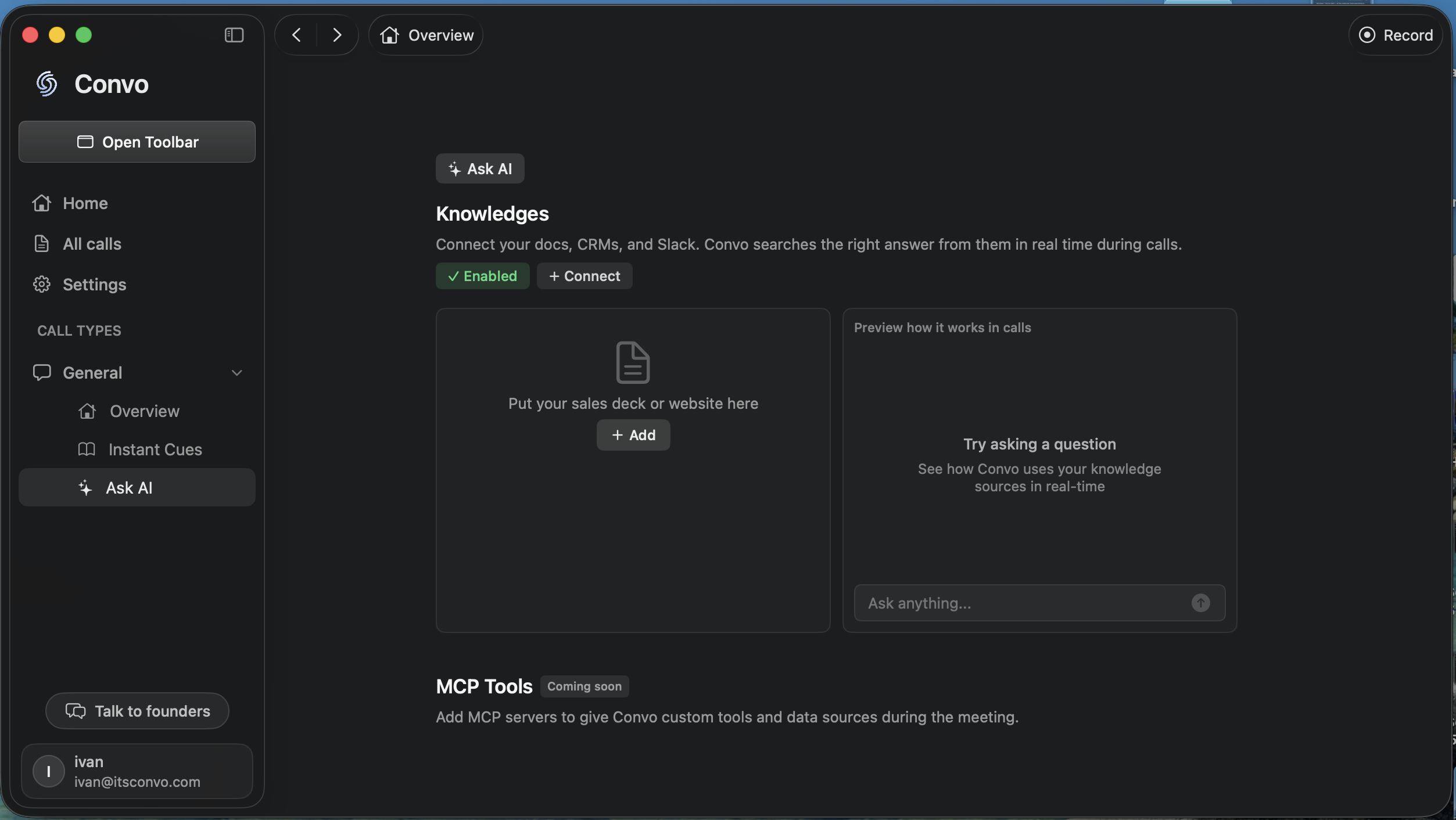 Convoは会議全体をサポートするデスクトップ中心のアシスタント。事前準備・会議中のリアルタイム支援・会議後のフォローアップをローカルで実行。メール下書き・タスク更新・要約を自動化。ダッシュボー...