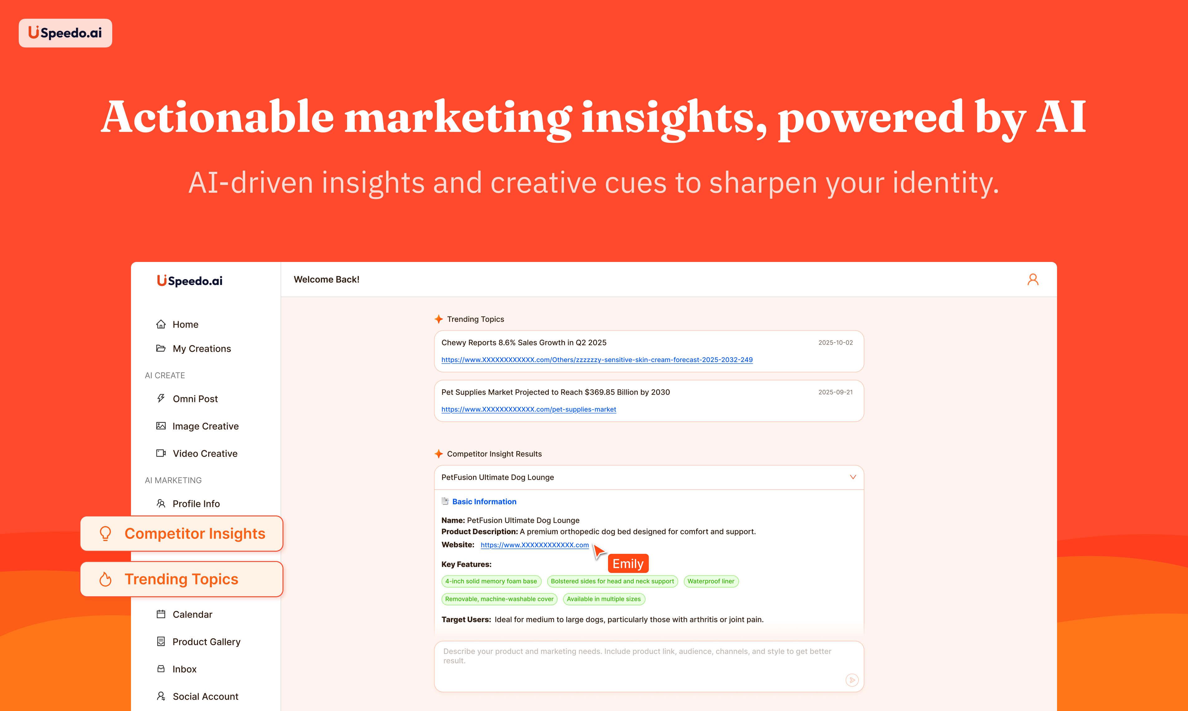 uSpeedo.aiは中小企業向けのAI搭載マーケティングツールキット。戦略からコンテンツ作成、反復までを自動化し、ブランドに合ったコピー・画像・短尺動画を生成。複数チャネルのキャンペーンを一元...