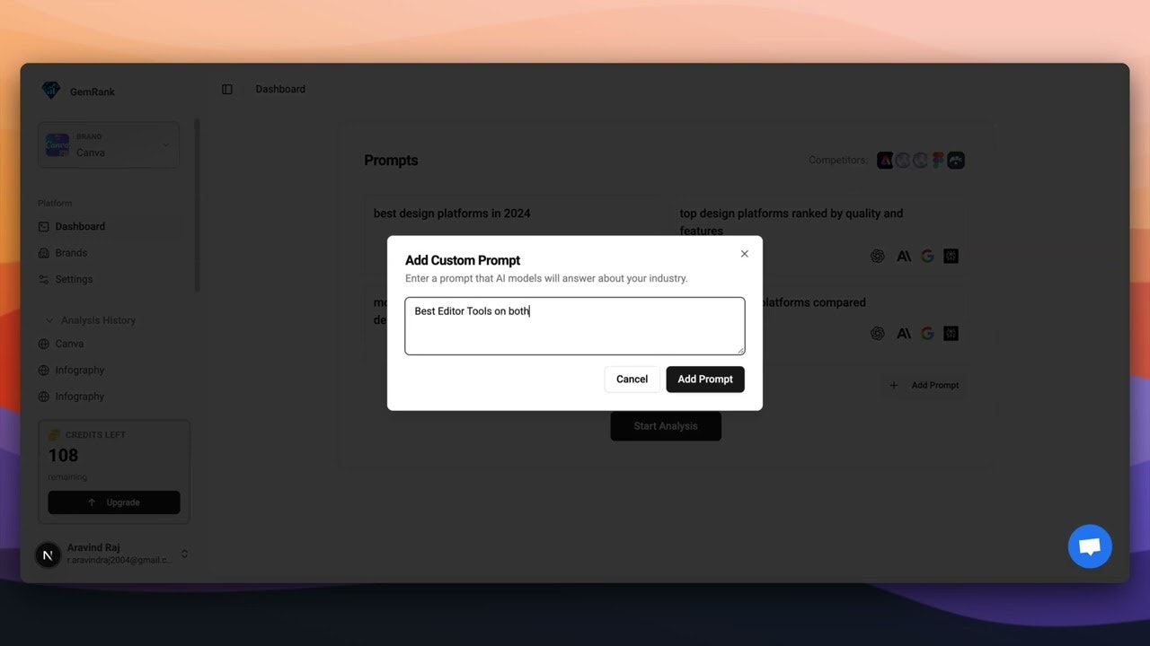## 概要 Gem RankはChatGPT、Gemini、Claudeなどがブランドを国別にどう語るかを監視・可視化するプラットフォーム。競合の比較と地域別の洞察を含む週次レポートを提供し、l...