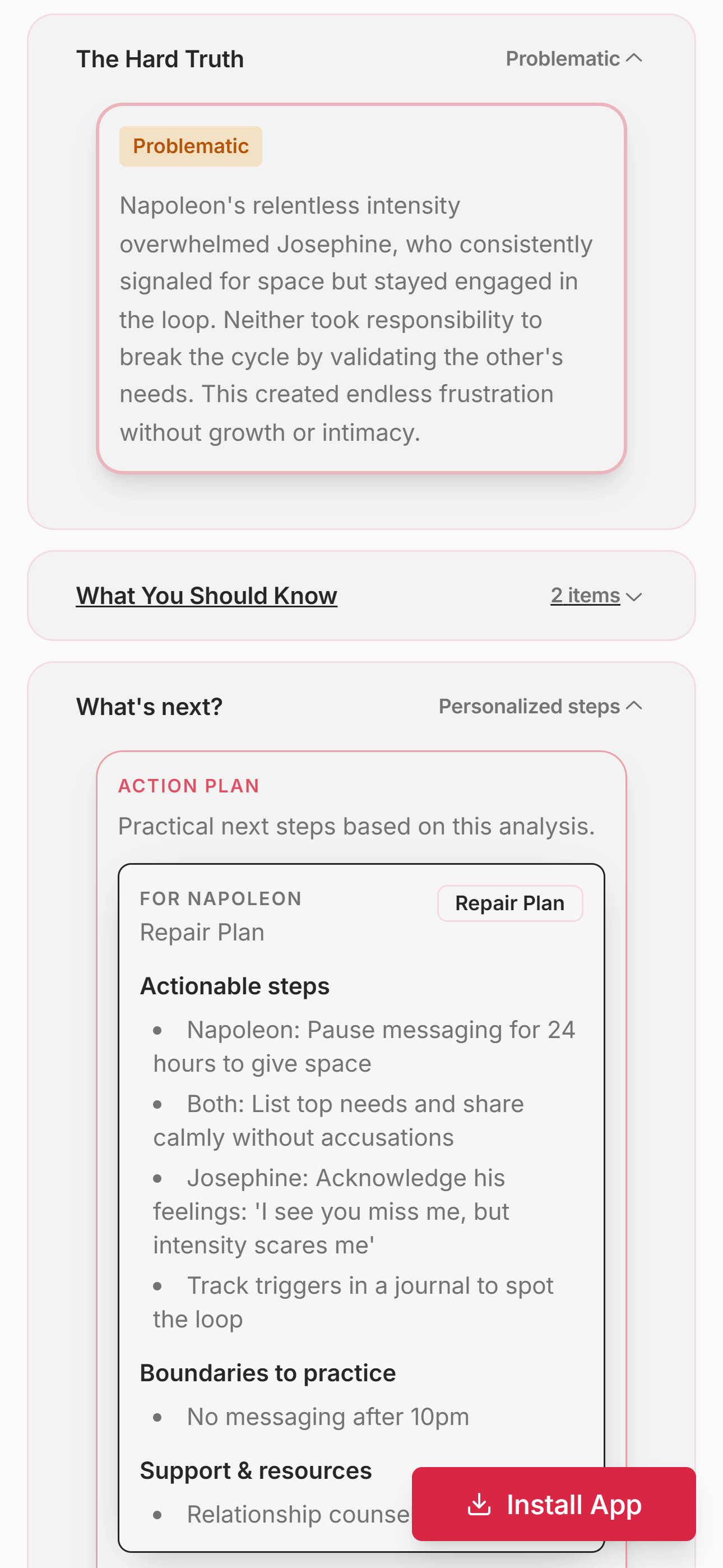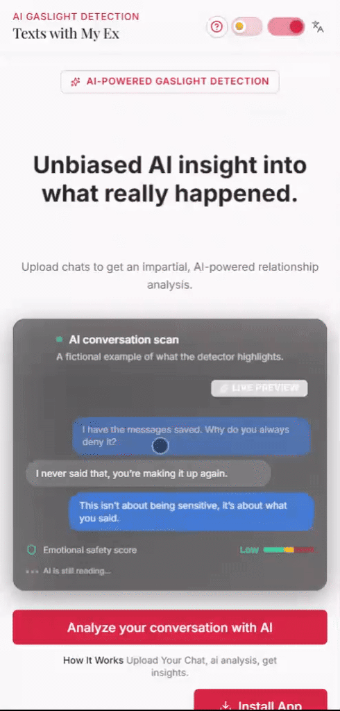 TextsWithMyEx は、チャットを分析して相手の操縦的傾向を判定する AI ツールです。喧嘩後の判断を補助し、20 秒でガスライティング・ラブボム・操作スコアを示すレポートを提供します。...