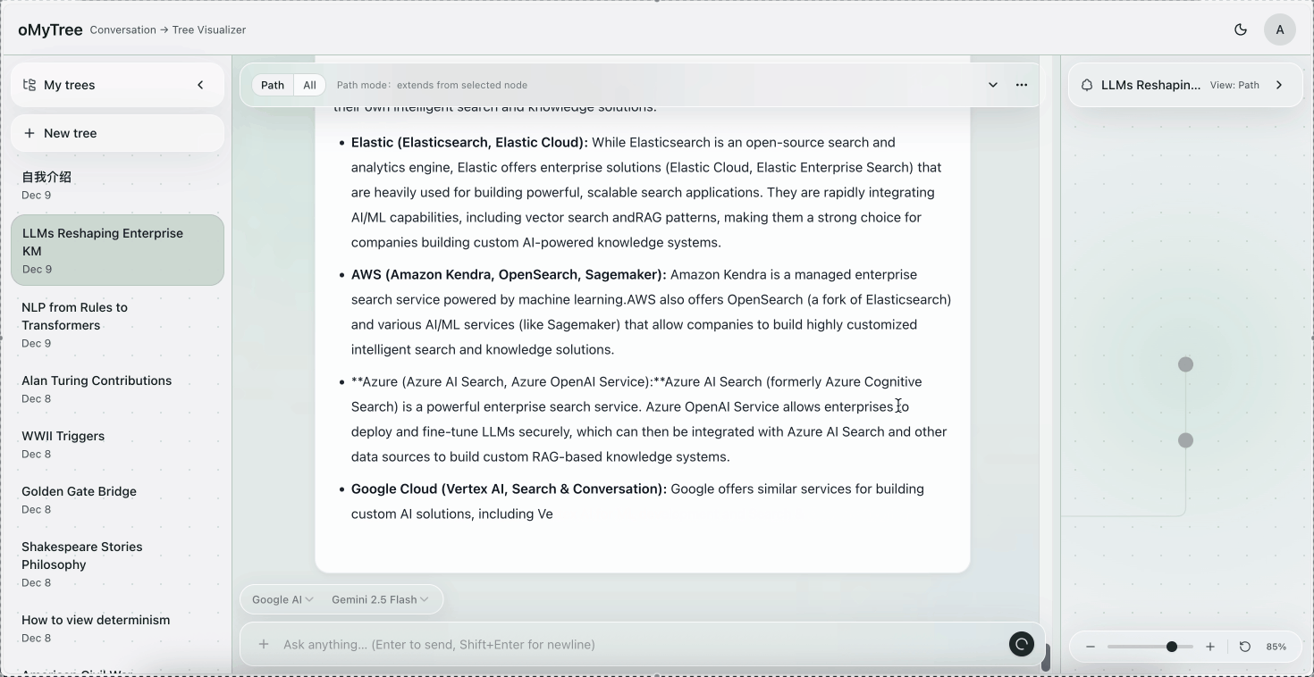 ## 概要 oMyTreeはAIとの会話を視覚的な知識ツリーに変換するツール。長い会話をノードと枝に分解し、思考の過程を辿れるようにします。 ## 主な特徴 - 1つの質問がノード、フォローア...