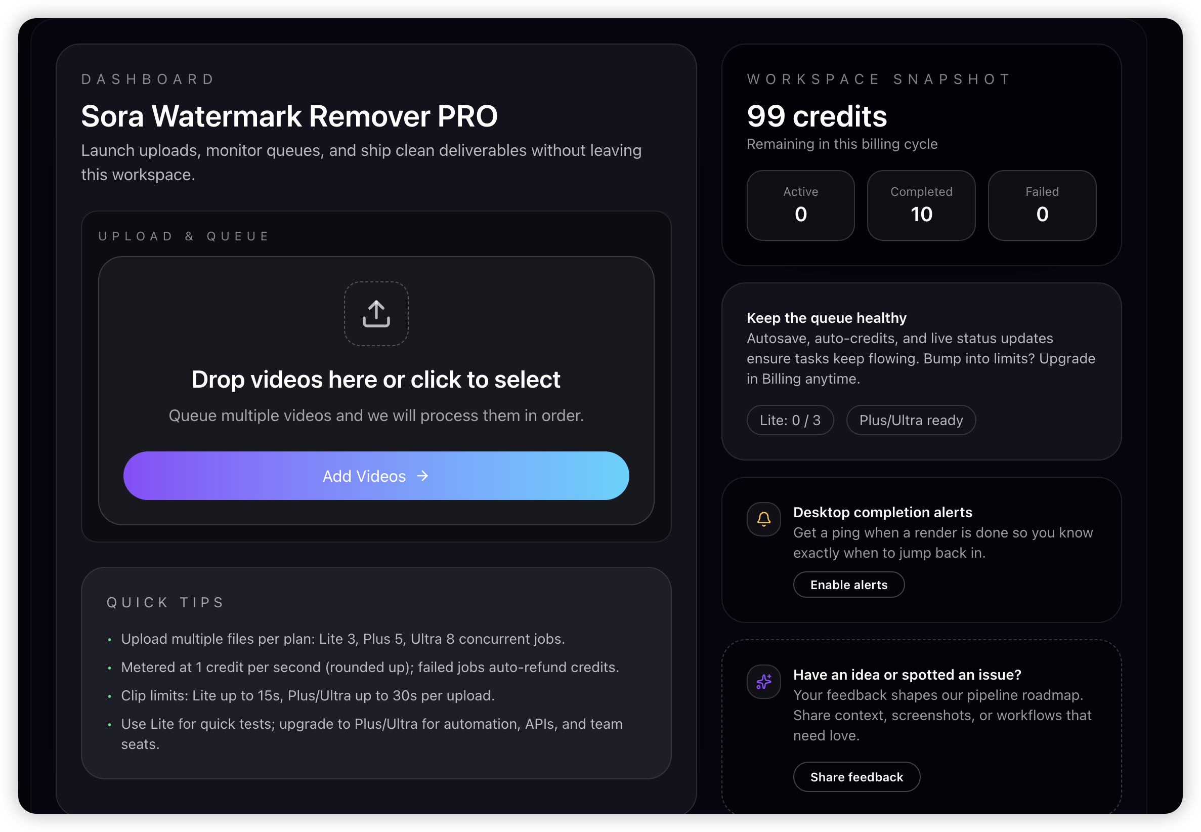 ## 概要 Sora2専用の透かし除去ツール。ログイン不要・ペイウォールなし・完全無料。処理は約3秒、出力は透かしなし。ベータ版以降、500人以上のクリエイターが日常的に利用しており、速度とSo...