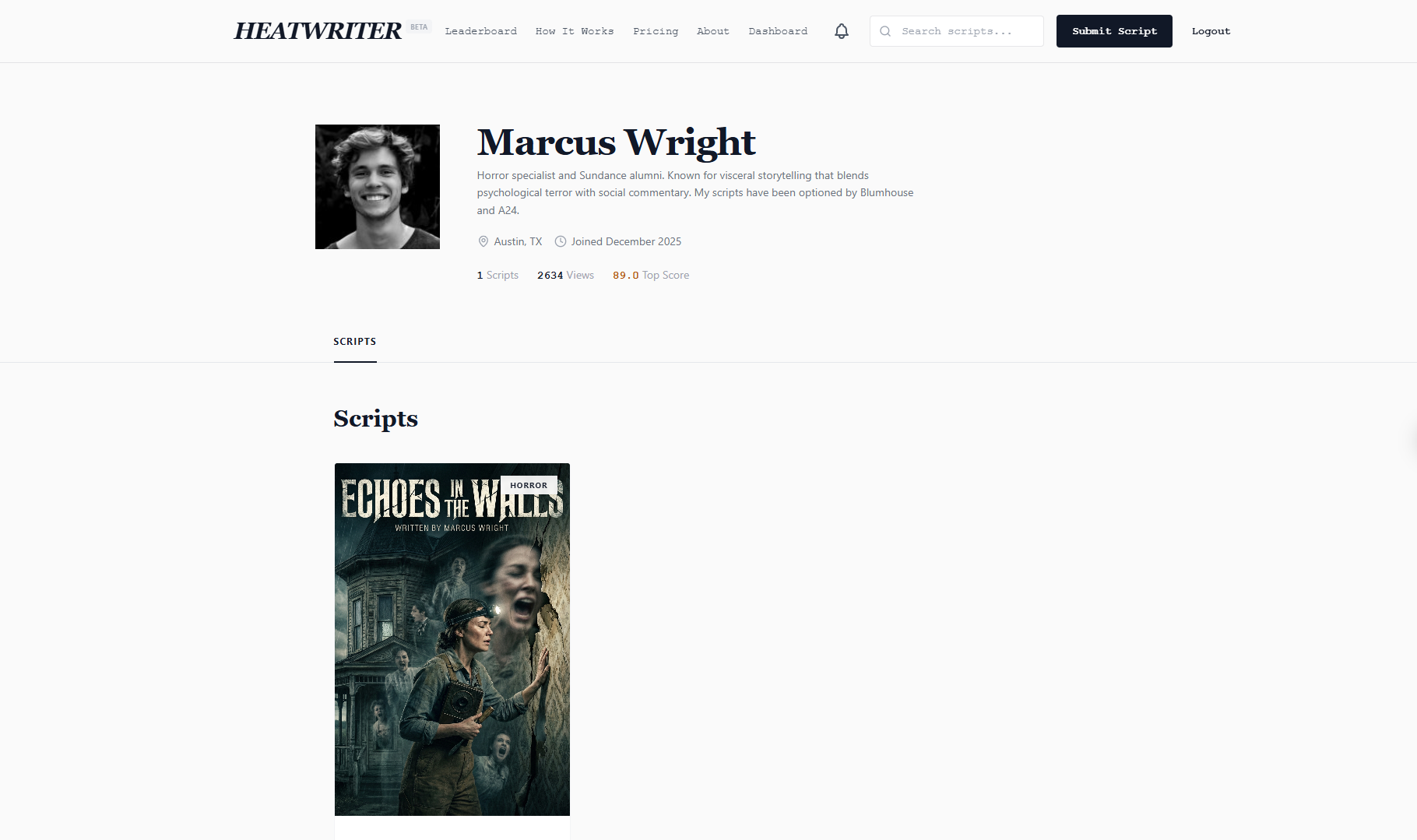 HeatWriterは公開型リーダーボードを通じて脚本家の可視性を高めるプラットフォームです。脚本を提出すると構成・対話・市場性が評価され、誰でも閲覧できるランキングで競い合います。コネは不要、...