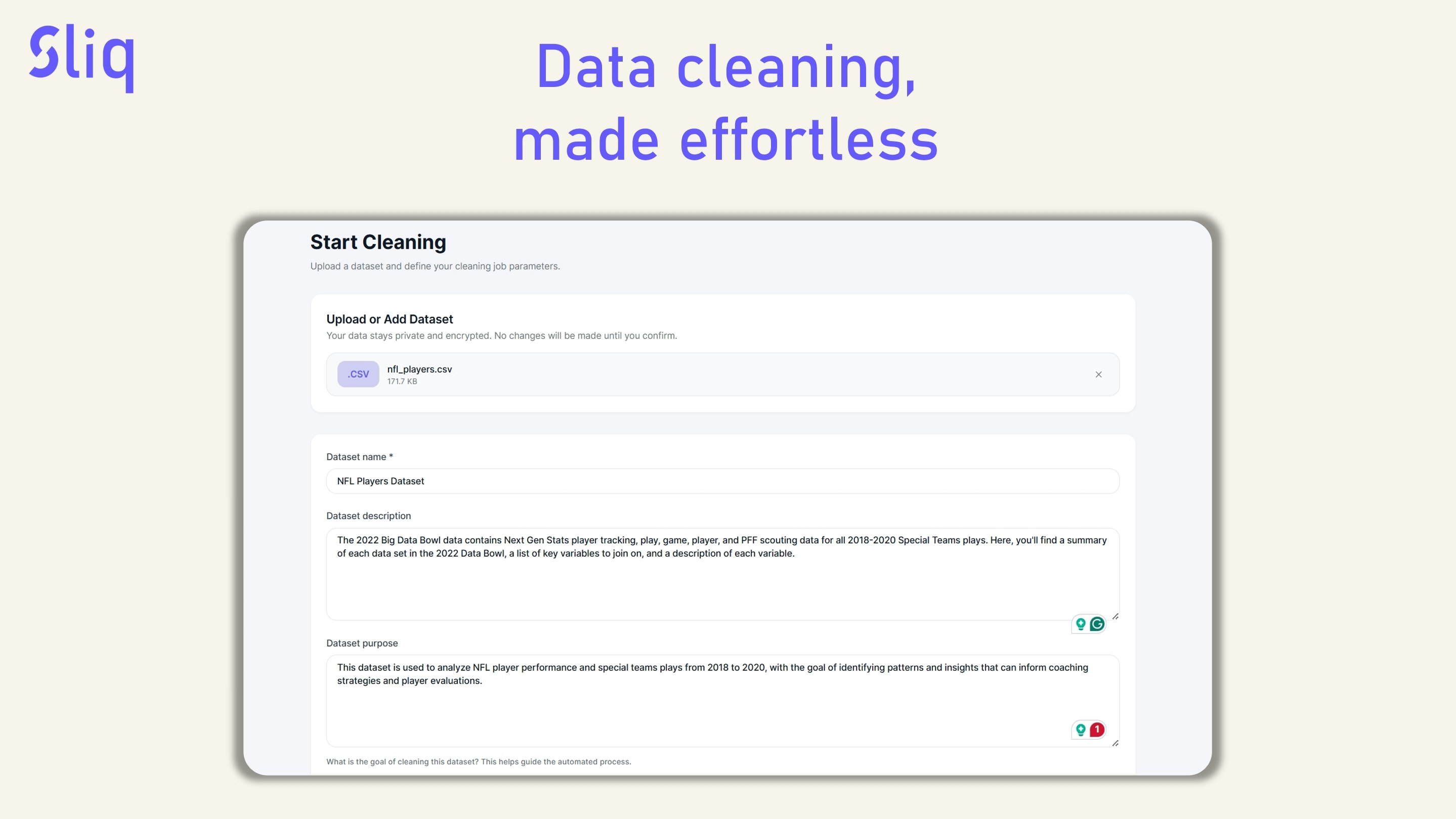 概要: Sliq はAIでデータの自動クリーニングを実現するツールです。ファイルをアップロードすると財務記録・ECログ・医療データ等の文脈を分析し、データが本来どうあるべきかを理解して品質課題を...