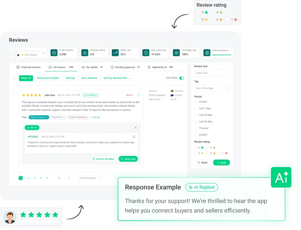 ## プロダクト概要 - PlayストアとAppストアのレビューをすべて自動監視。ネガティブも含めて見逃さず、迅速な対応を支援 - 感情分析と人間らしい返信を自動生成。返信品質を保ちつつ作業を大...