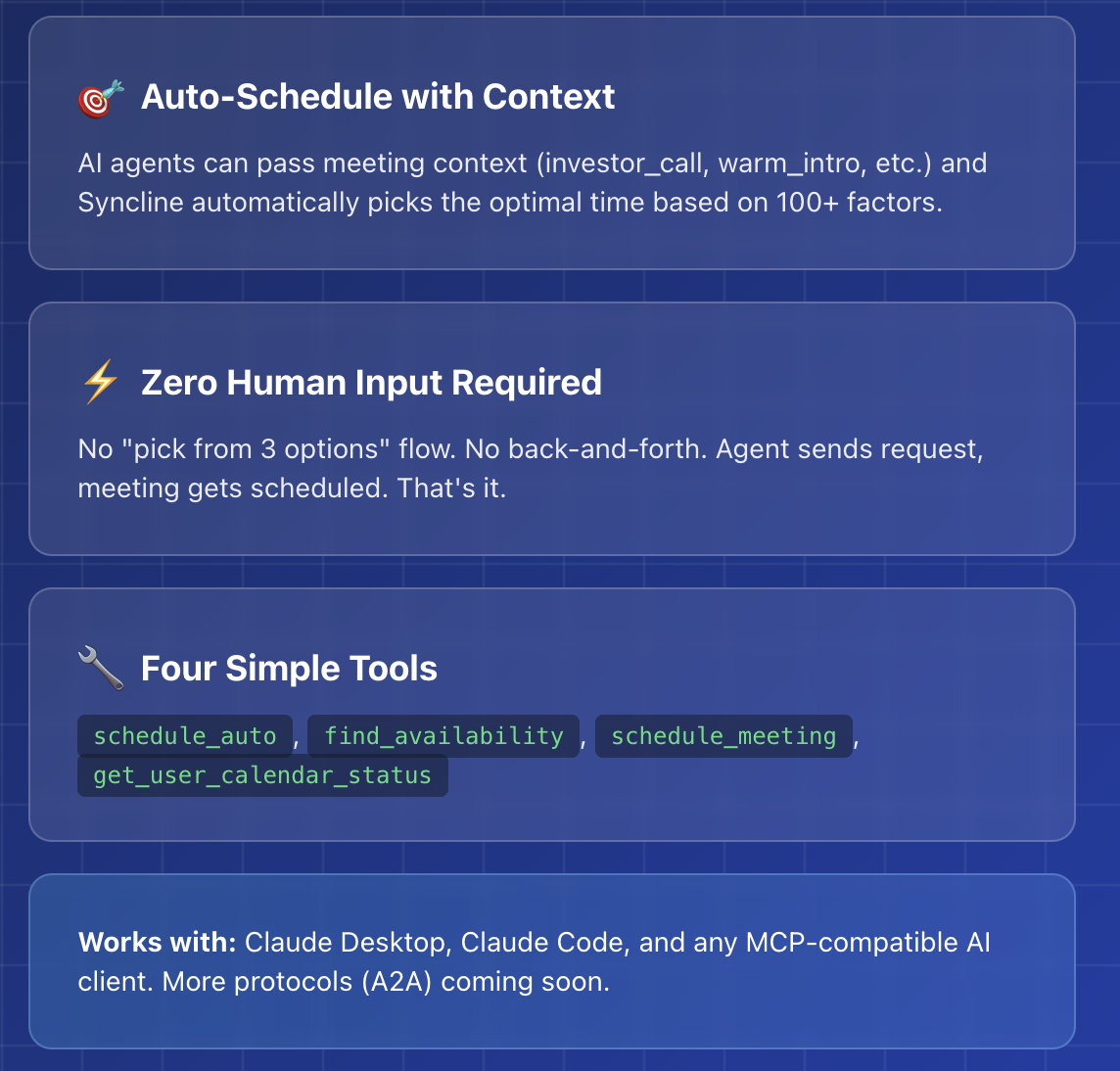 ## 概要 SynclineはAI主導のスケジューリングAPI。複数人が同意済みの会議時間を自動で見つけて予約します。候補の提示や往復のやり取りを不要にし、文脈・好み・カレンダー情報を統合して端...