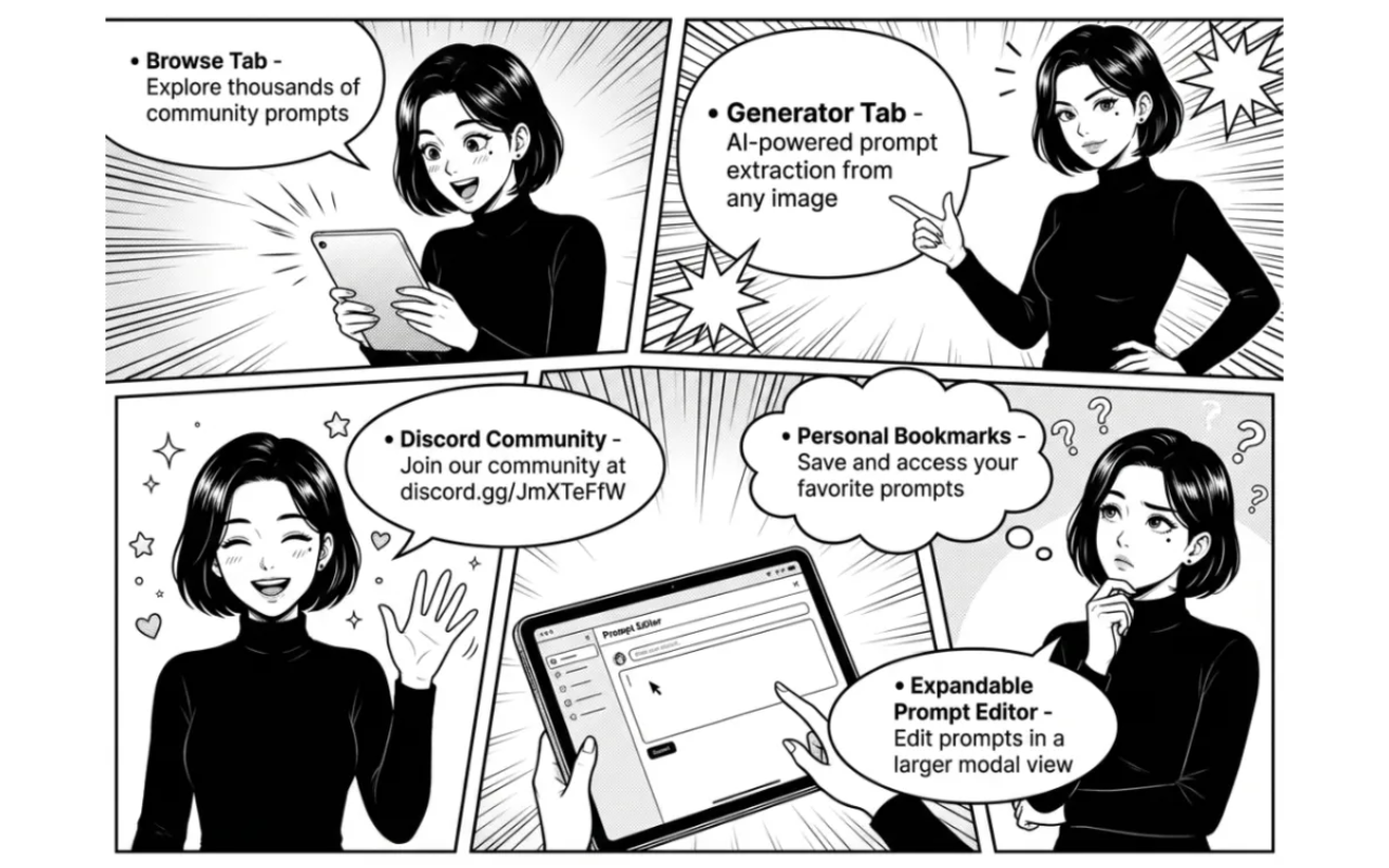 ナノバナナプロンプトの発見・作成・共有を軸にしたAI画像プロンプトのエコシステム。コミュニティの人気プロンプトを閲覧・比較し、画像からプロンプトを抽出して新たな創作に活かせる。自分のプロンプトを...