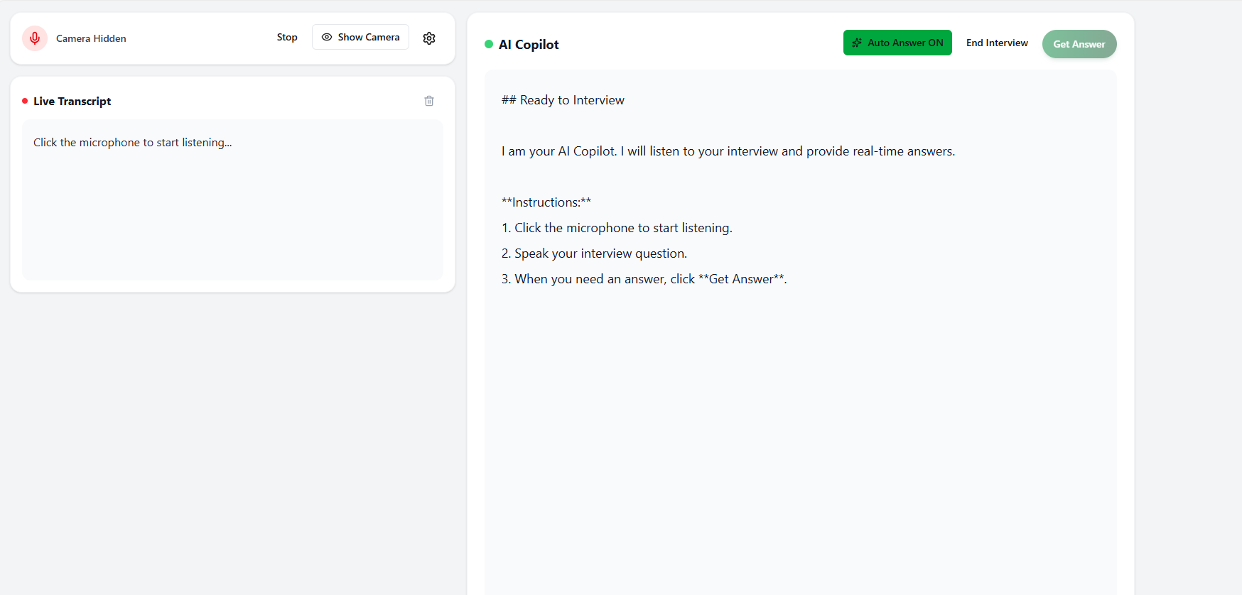 ## 概要 面接時のリアルタイムAI支援で、プレッシャー下でも適切な回答を画面に表示するツール。 ## 主な特徴 - リアルタイムAI回答の表示 - 履歴書を元にした個別最適化 - 52言語以...