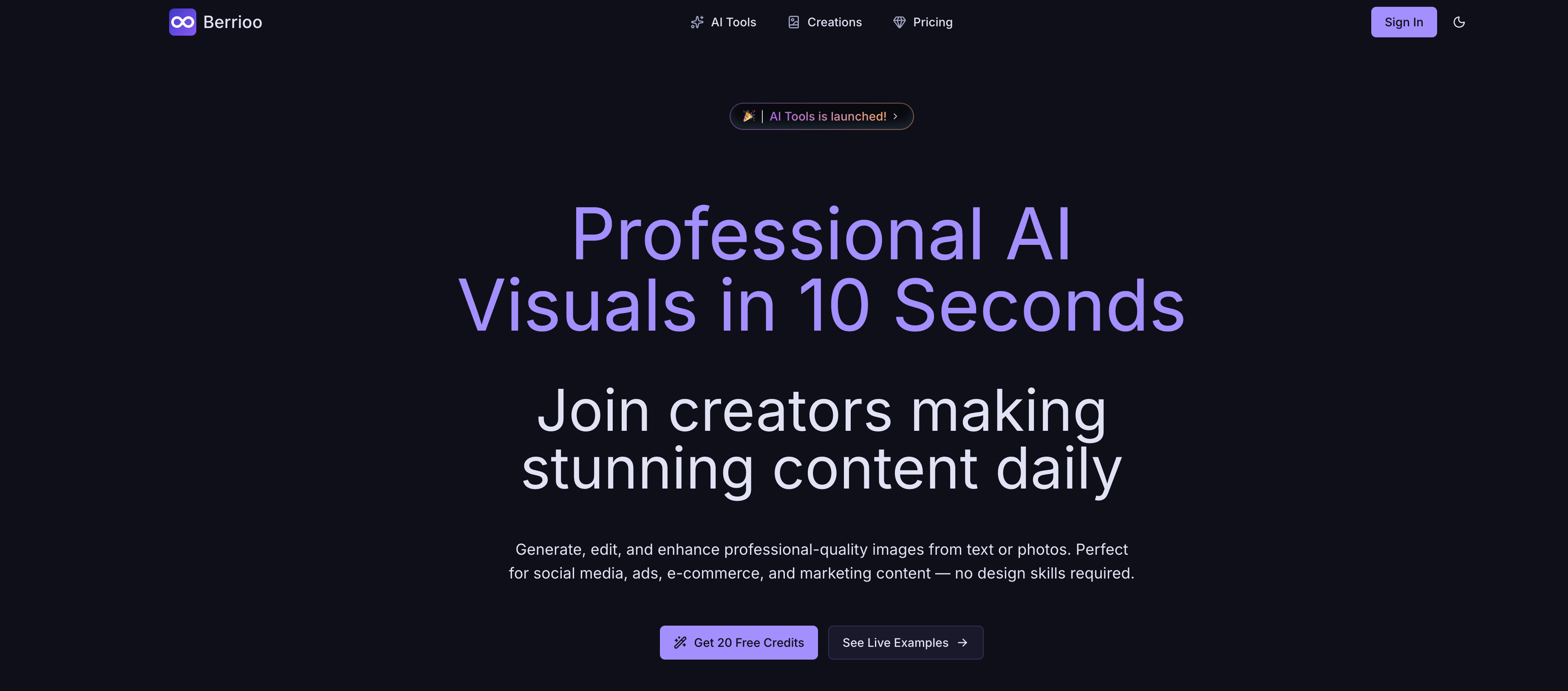 ## 製品概要 Berrioo は、デザイン知識がなくてもAIを使って高品質な画像を手軽に作れるツールです。テキスト説明を美しいビジュアルへ変換、写真をAIスタイルで加工、背景を削除して編集、無...