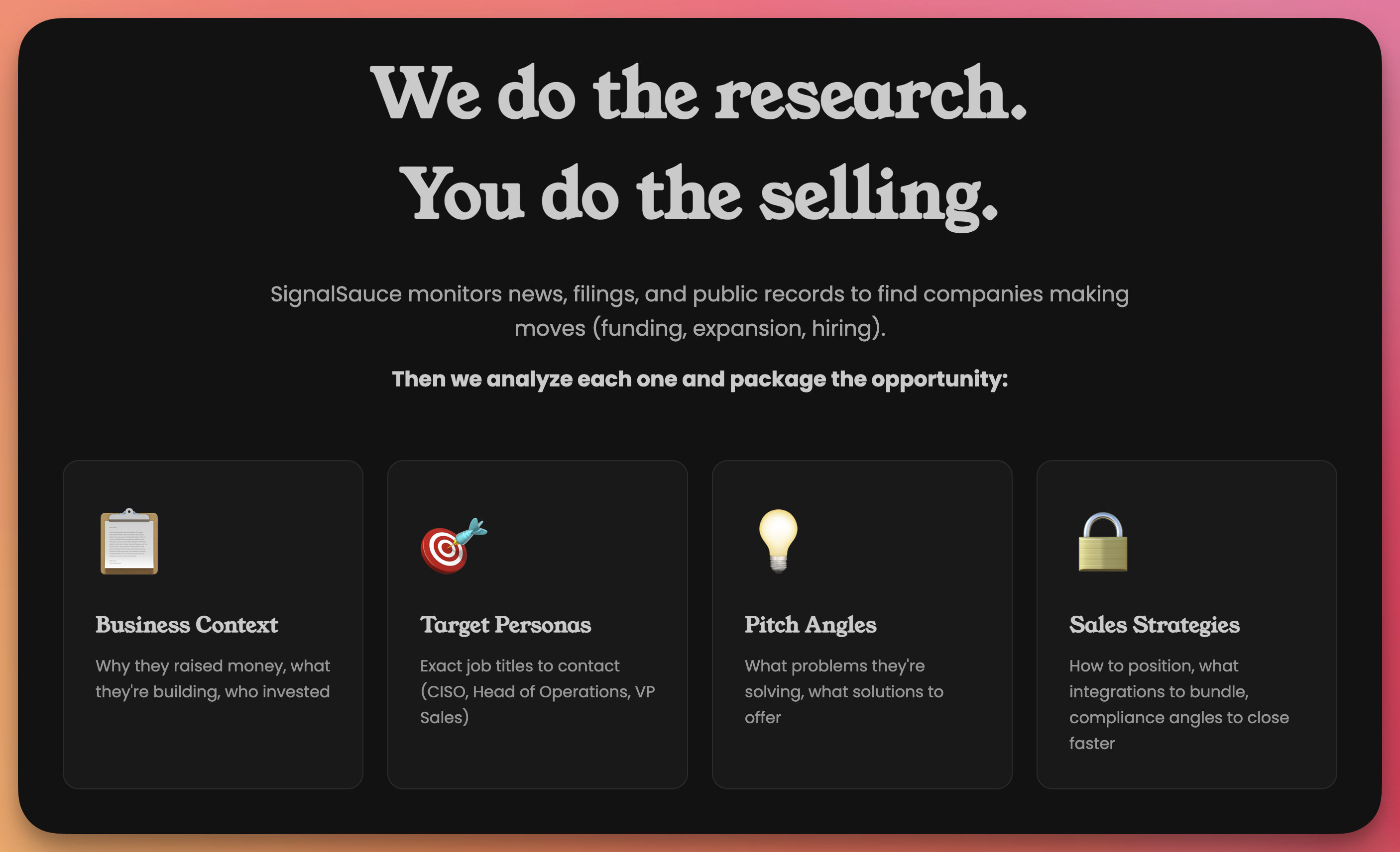 ## 概要 SignalSauceは、UK/欧州の資金調達直後の企業を、アプローチ可能な完全情報とともに月50〜100社提供するセールスインテリジェンスサービスです。データは1〜30日で新鮮、資...