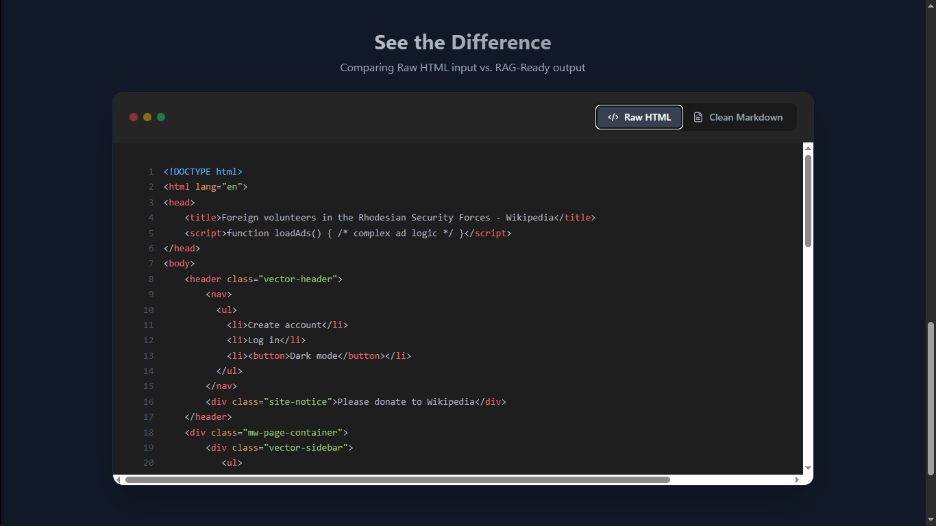 RAG Playgroundは、任意のURLをLLMが使えるMarkdownへ変換するシンプルなツールとAPI。HTMLの表層を剥ぎ落とし、広告・スクリプト・ナビを自動で除去。GPT系LLM向け...