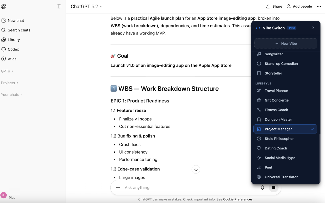 ## 概要 ChatGPTとGeminiに恒常的なパーソナリティを付与するサイドバー機能。初期設定のヴァイブを一度選べば、以降のプロンプトはそのマインドセットのまま動作する。30以上の専門ヴァイ...