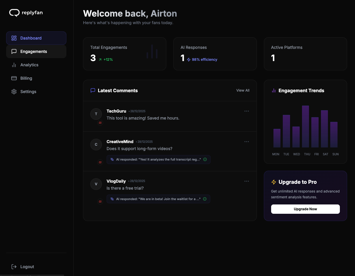 ## 製品概要 ReplyFanは、クリエイターのコミュニティ形成をAIで加速するツールです。あなたの声に寄り添うパーソナルAIが、定型的な返信を減らしつつ人間味を保ちながら返信を作成します。 ...
