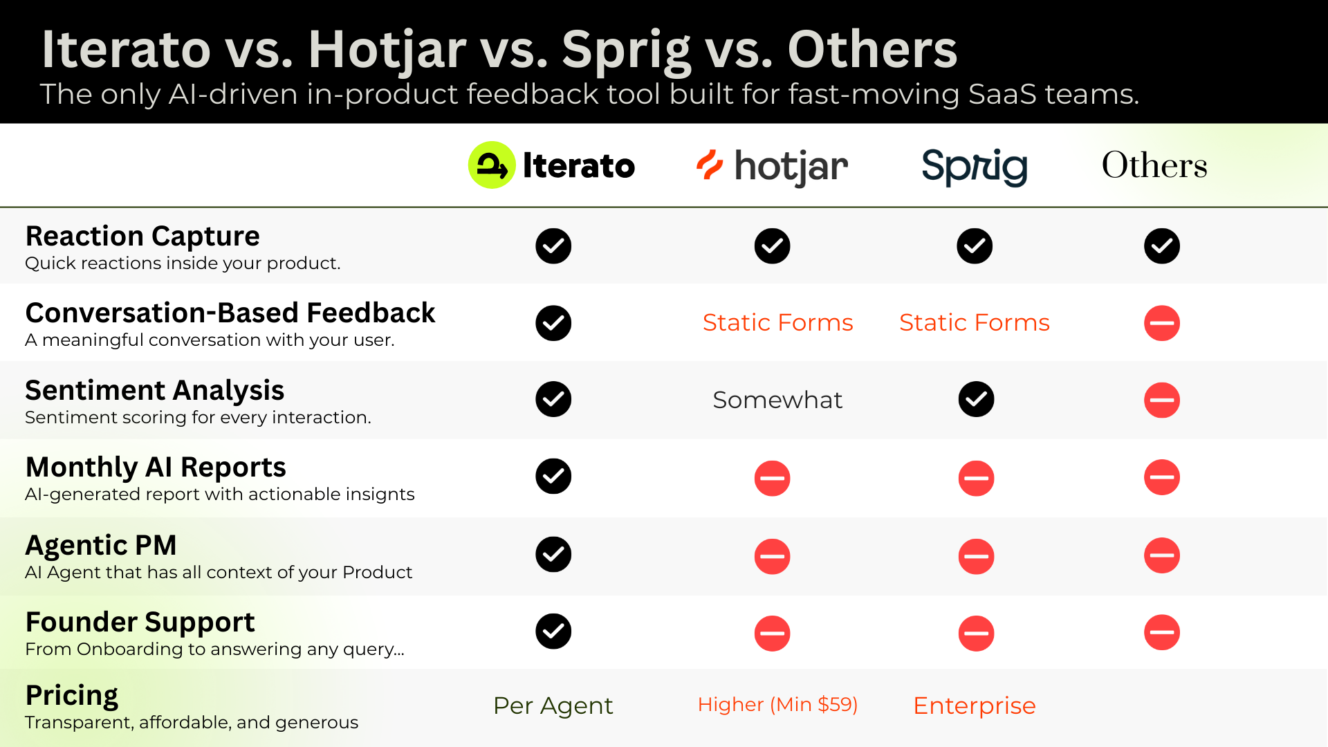 ## 概要 Iteratoはプロダクト内に組み込まれたAI PMエージェントで、ユーザーとリアルタイムに対話し、文脈に応じたフォローアップを自動で行います。従来のフィードバックツールがデータ収集...