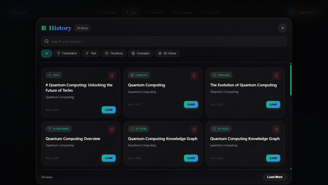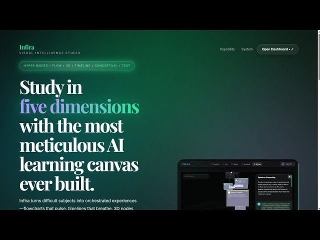 ## 概要 Infiraは複雑なテーマを生き生きとした視覚体験へ変える多次元学習エンジン。鼓動するフローチャート、呼吸するタイムライン、自己構築する3D概念マップなど、理解を速め、記憶を長く保ち...