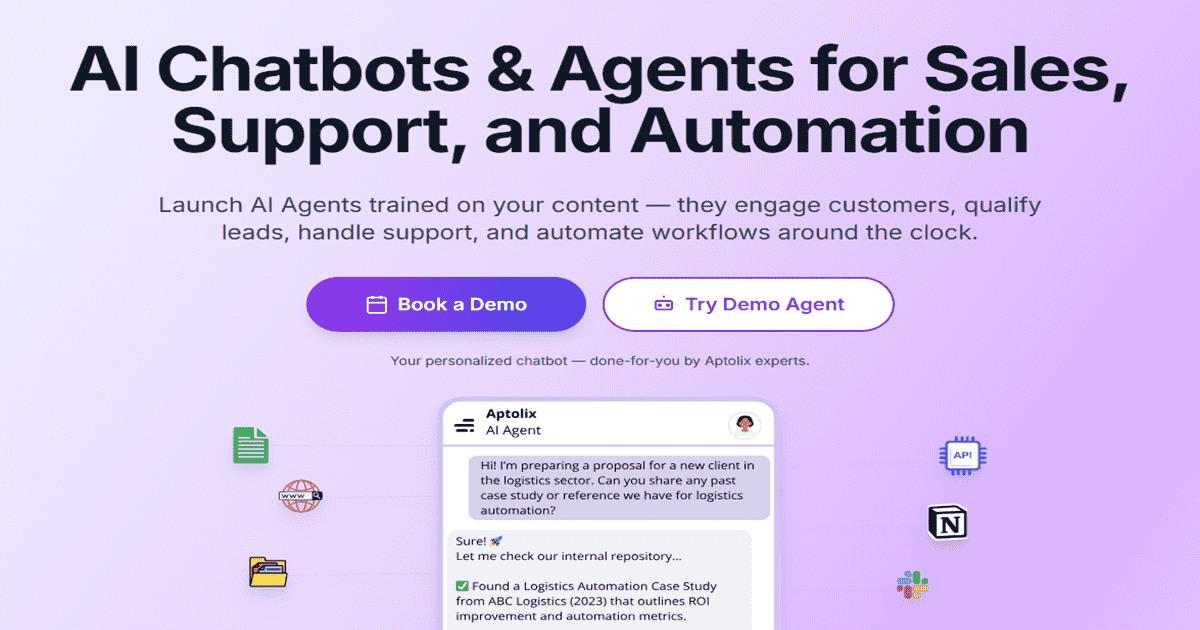 Aptolixは会話を超えるエージェント型AIを提供。意図を理解し、実際の行動を起こしてワークフローを自動化し、タスクをトリガーしてビジネス成果を推進します。単なるチャットボットではなく、分析機...