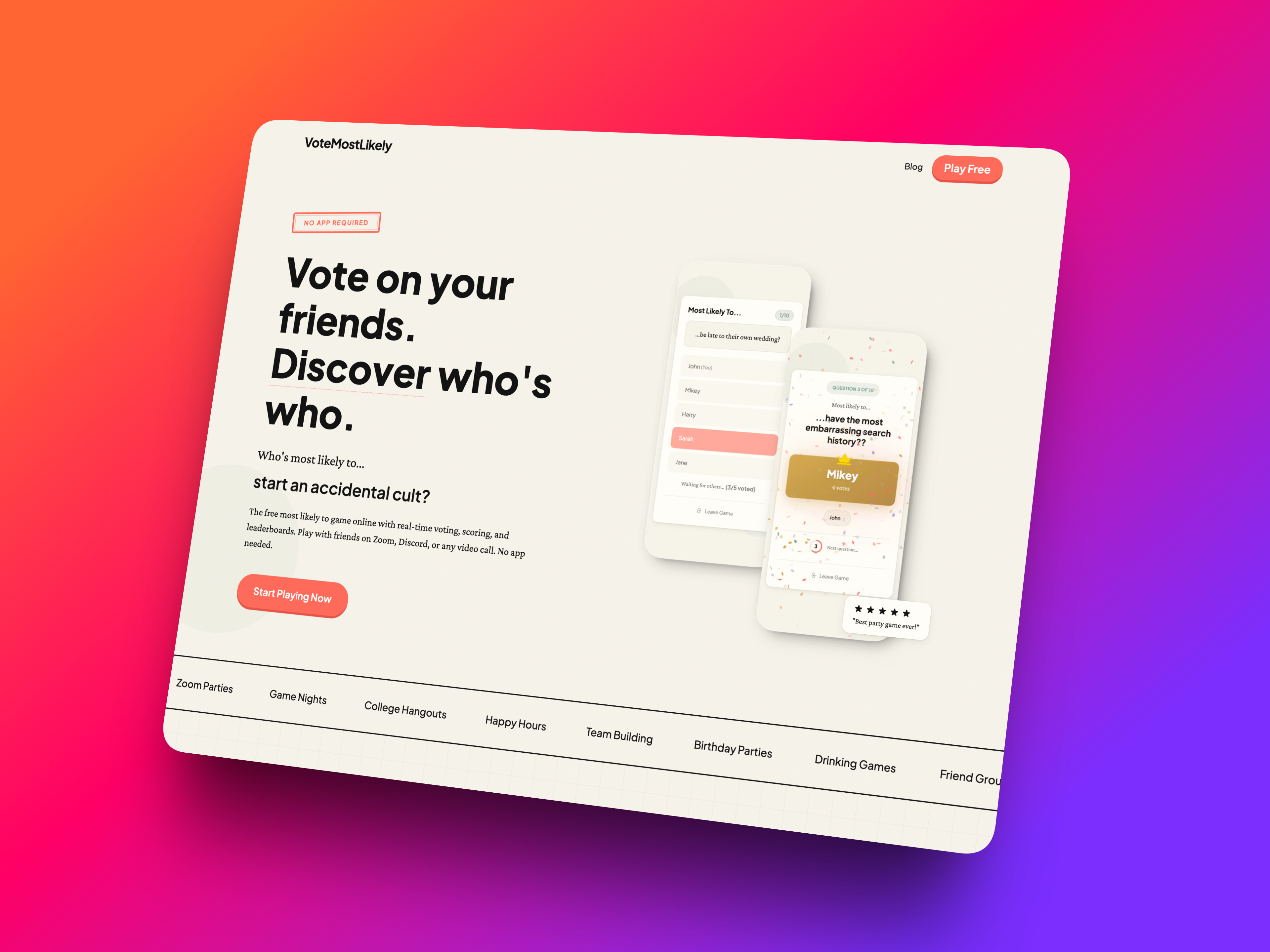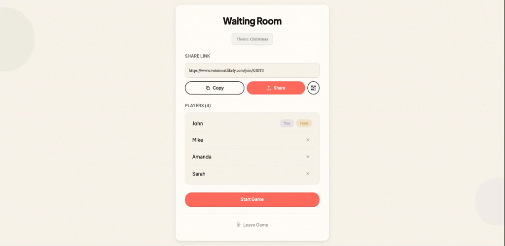 このプロダクトは、リンクを共有するだけでブラウザ上から参加できるゼロフリクションのパーティーゲームです。アプリ不要でスムーズに遊べ、無料プランには30問が用意されています。特徴は2つ。1) テー...
