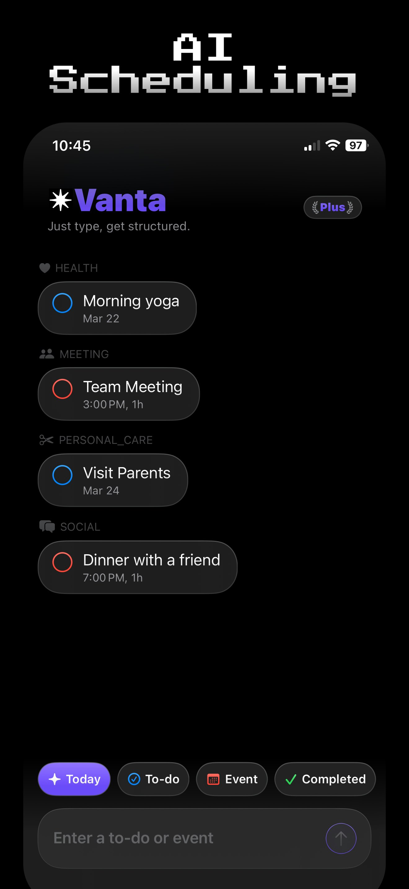 ## 概要 Vantaは、AIを活用したスケジューリングアシスタントです。以下のような機能を提供しています: - 自然言語での入力を基にしたイベントの自動生成 - 整理されたスケジュールの作成...