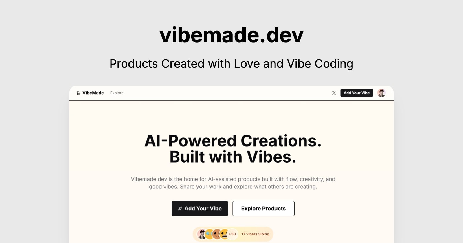 ## プロダクト概要 Vibemade.devは、AI技術を活用したクリエイティブな作品を生み出すためのプラットフォームです。このコミュニティは、クリエイター同士が自らの作品を共有し、相互にイン...