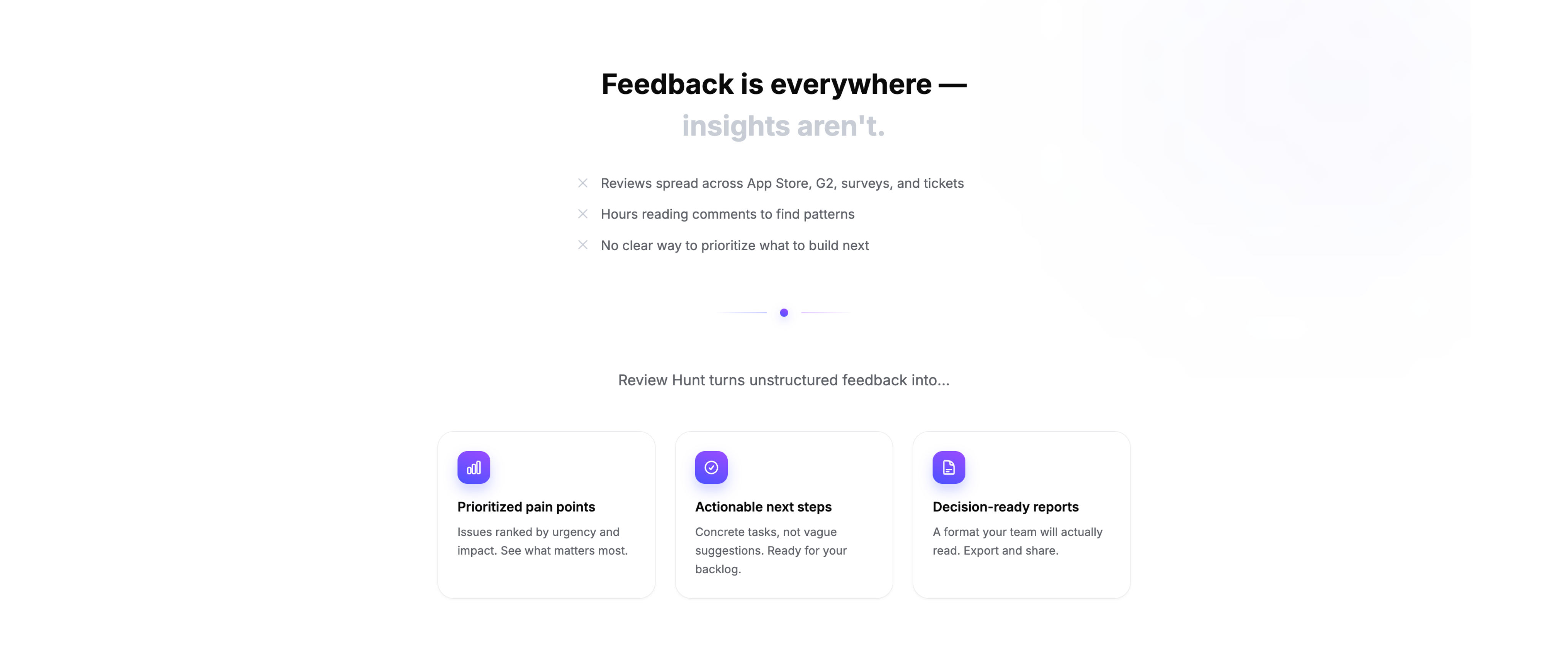 ## 概要 AIを用いて顧客レビューを分析・要約し、数分で本質的な洞察を提供します。散在するフィードバックを明確で実行可能な洞察へ変換し、製品チームの意思決定を迅速化します。 ## 主な特徴 ...