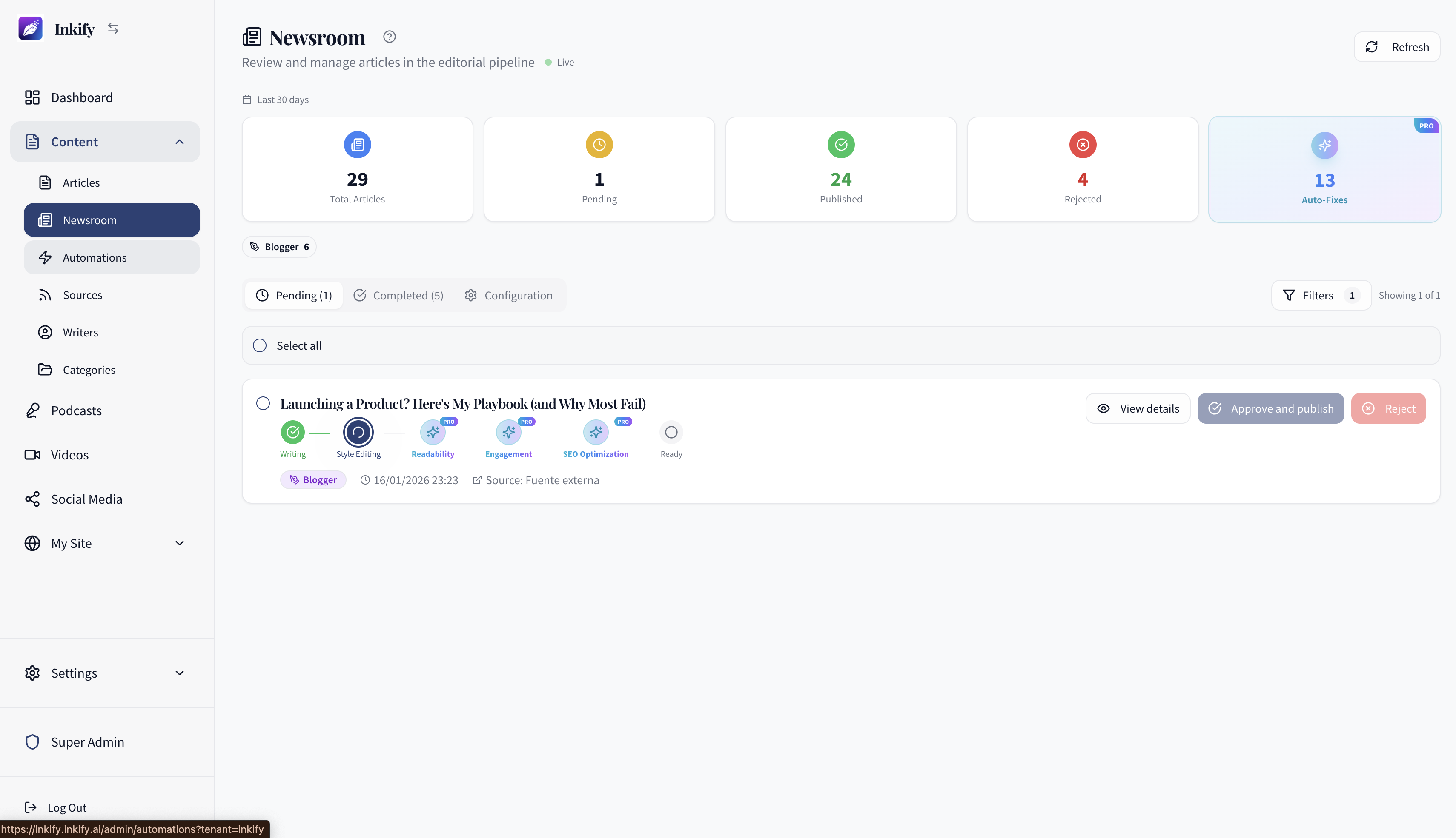 ## 概要 - InkifyはAI搭載の自動運転型コンテンツスタジオ。1つのアイデアを高品質な記事・ポッドキャスト・動画へ自動変換します。 - カスタムAIライターを訓練して自社ブランドの声で執...