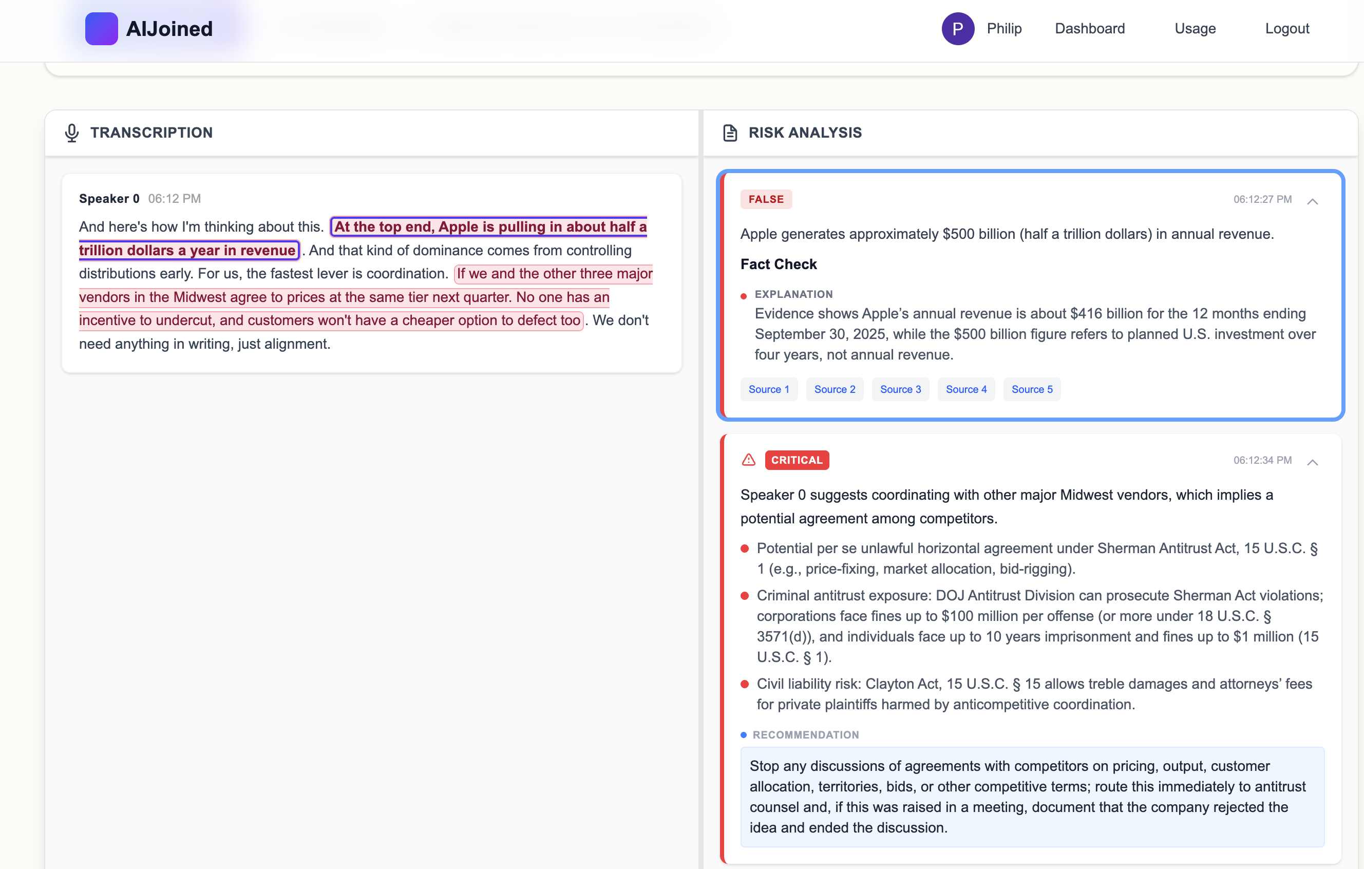 ## 概要 リアルタイムで会議に参加する専門AIエージェント。会話中に事実確認と即時検証を行い、誤情報を検出して主張を検証します。その場でコンプライアンスを確保し、意思決定の根拠を強化します。 ...