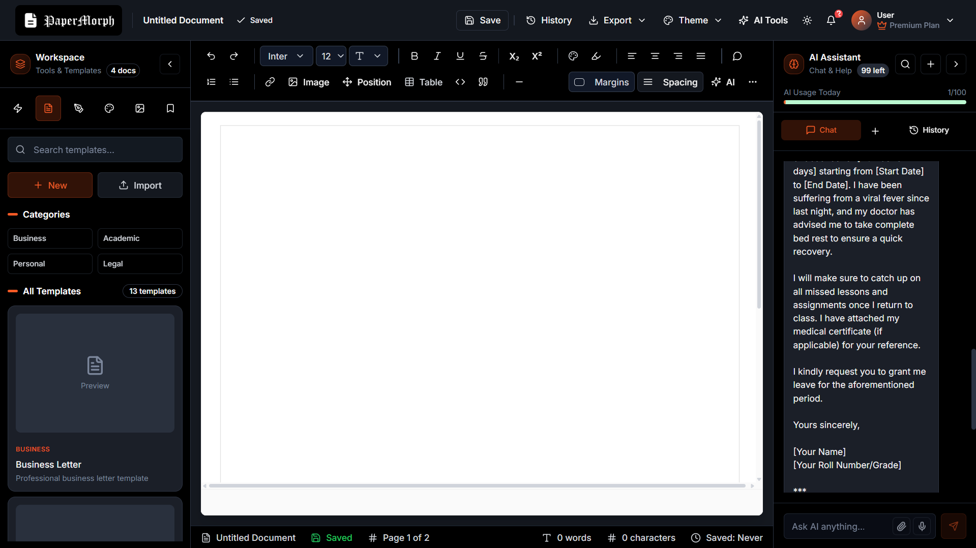 PaperMorphは、Word風の作業空間にAI作成・書式設定機能を内蔵した文書エディタ。従来のChatGPTとWordの切替を不要にし、エディタ内で手紙・レポート作成、要約、文法修正、書式自...