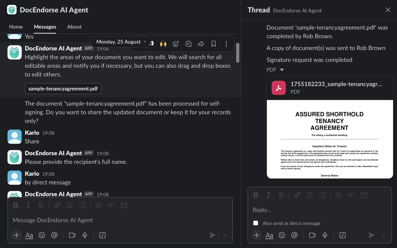 Slack 上で動作する AI 搭載の電子署名アシスタントとして、自然言語で署名依頼を送信・追跡・フォローアップが完結します。フィールド検出・役割割り当て・適切な宛先の特定を自動化し、DMs/@...