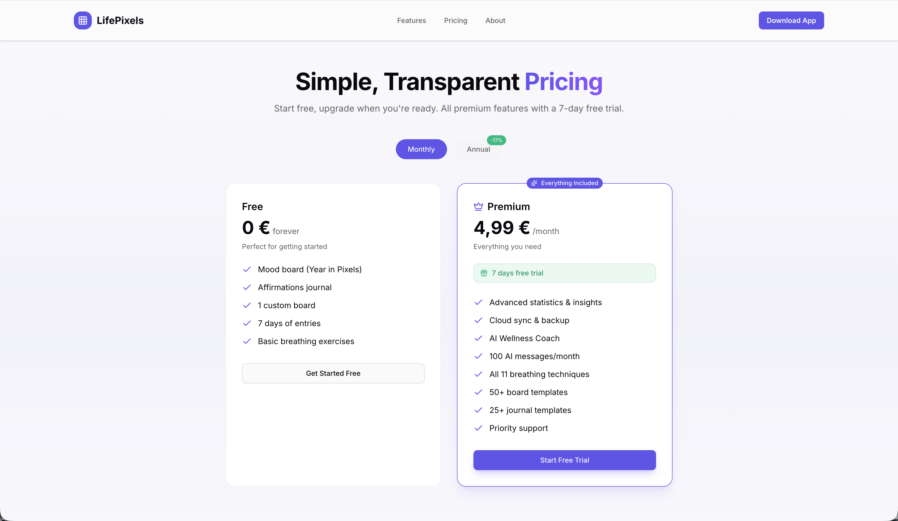 ## プロダクト概要 - AI搭載の習慣・気分・日記トラッカー - Year-in-Pixels の視覚化で日々の進捗を直感的に把握 - 科学的根拠に基づく手法(呼吸法でコルチゾールを23%低下...