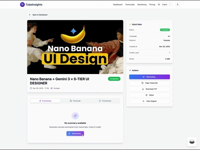 ## 概要 TubeInsightsはYouTubeの文字起こしを自動抽出し、AI要約を生成、好みのチャンネルを監視するツールです。 ## 主な機能 - 多言語対応の文字起こし - インテリジ...