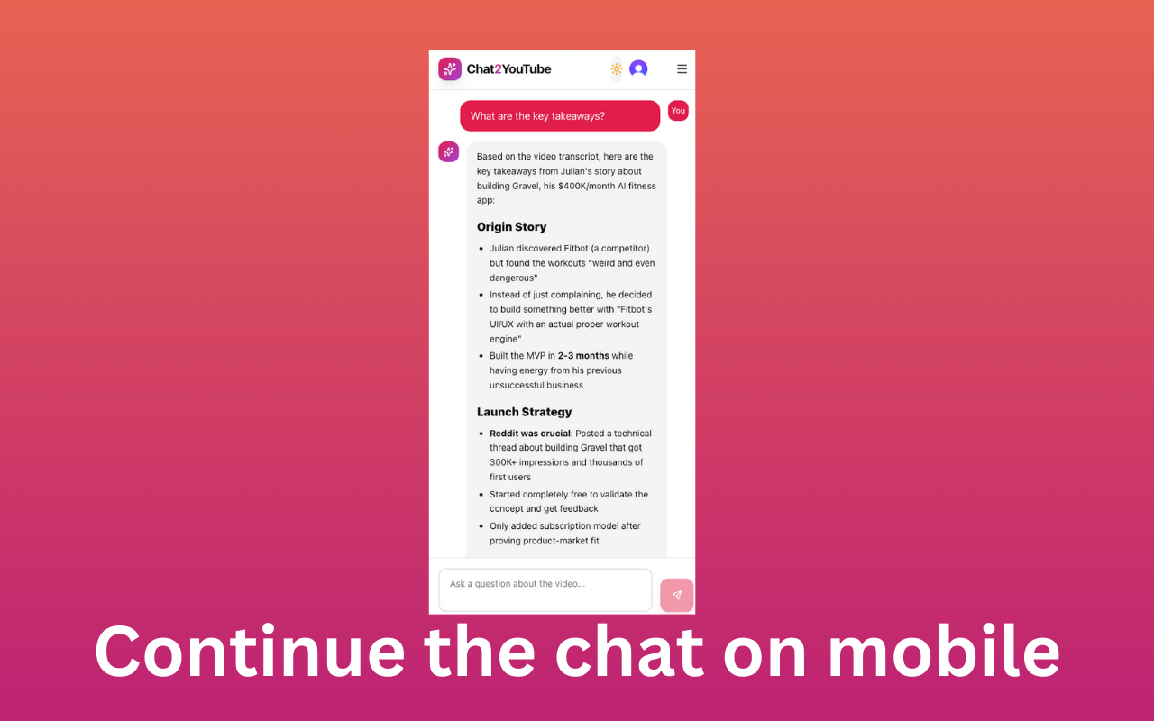 Chat2YouTubeは、YouTube動画の文字起こしをAI対話で活用するサービスです。リンクを貼るだけで会話を開始し、動画内容を要約や質問へAIが回答します。拡張機能と前置きトリックの二通...